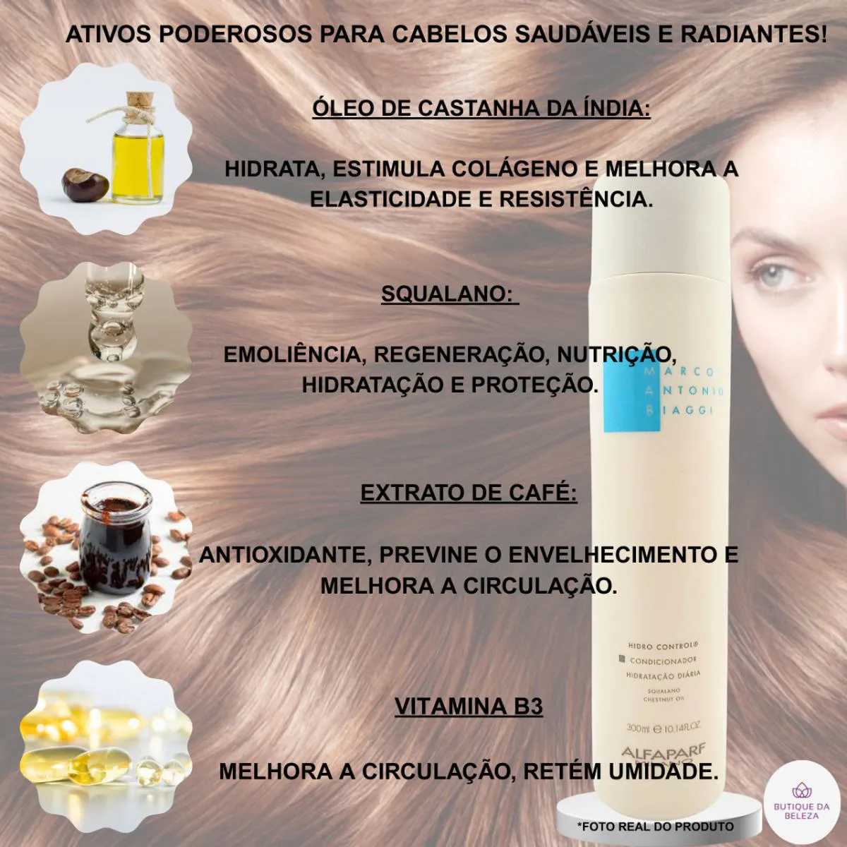 SERVIR E AJUDAR SÃO NOSSOS DEVERES condicionador MAB ALFAPARF MILANO - HIDRO CONTROL Resgate Seus Cabelos danificados Cansada de Lutar Contra Cabelos Secos e Sem Vida? Imagine acordar todos os dias com cabelos hidratados e resistentes. O Condicionador Mab Hidro Control restaura a vitalidade e o brilho dos seus cabelos, proporcionando uma hidratação profunda e duradoura. Com uma combinação poderosa de óleo de castanha da Índia, squalano, extrato de café e vitamina B3, esta fórmula hidrata, fortalece, estimula a produção de colágeno, melhora a circulação sanguínea e protege seus fios contra o envelhecimento, formando uma barreira que retém e controla a umidade dos cabelos, deixando-os macios, resistentes e com um brilho intenso. Hidratação que Você Pode Ver e Sentir! INDICADO PARA QUAL tipo de cabelo Cabelos Secos e Opacos Cabelos Danificados e Sem Brilho Todos os Tipos de cabelo BENEFÍCIOS Hidratação Profunda: Fios profundamente hidratados e nutridos, textura mais suave e sedosa. Brilho Intenso: Cabelos com um brilho natural e saudável, mais radiantes e vibrantes. Fios Fortalecidos: Menos quebra e maior resistência capilar. Proteção contra o Envelhecimento: Ação antioxidante para prevenir o envelhecimento precoce. Controle da Umidade: Prevenção do ressecamento e fios macios. RESULTADOS Cabelos Macios, Hidratados,Brilhantes e Resistentes Reduz a Oleosidade e a Queda dos Fios Redução Significativa no Frizz Fios com uma aparência mais jovem.