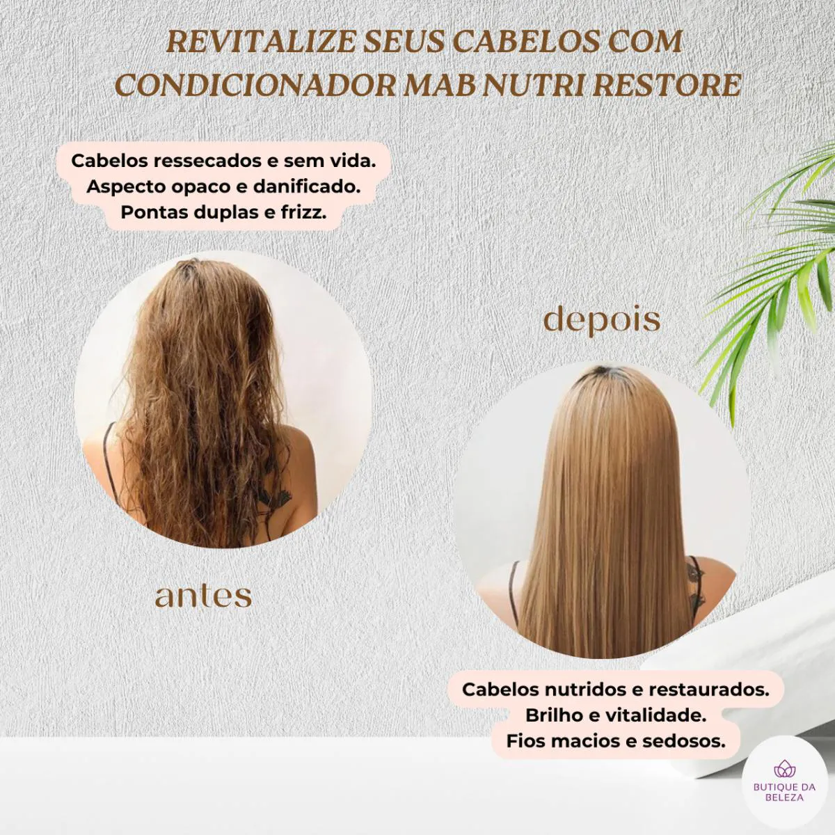 BENEFÍCIOS Nutrição Profunda: Ingredientes selecionados que nutrem profundamente a fibra capilar, restaurando cabelos danificados. Hidratação Intensa: Proporciona uma hidratação duradoura, deixando os cabelos macios e brilhantes. Reparação de Danos: Repara os danos causados por processos químicos, calor excessivo e exposição ao sol. Redução do Ressecamento: Alivia o ressecamento e as pontas duplas, promovendo uma aparência mais saudável e bonita. Brilho Radiante Imediato: Partículas de brilho instantâneo refletem a luz, proporcionando um efeito gloss. Redução de Pontas Duplas: Fórmula com ácido hialurônico que sela as cutículas e reduz pontas duplas. Preservação da Cor: Mantém a cor vibrante dos cabelos coloridos, evitando o desbotamento. RESULTADOS +89% de Maciez -62% de Frizz em Ambientes Úmidos. 3x Mais Brilho Comparado a shampoos Comuns. Reduz 90% das Pontas Duplas Recupera a Elasticidade e Reduz a Quebra em 70% Cabelos 3x Mais Maleáveis Fios Cuidados, Nutridos e com Brilho Intenso MODO DE USO Aplique o condicionador em cabelos úmidos, após o shampoo, massageando suavemente do comprimento às pontas. Deixe agir por alguns minutos para que os ingredientes possam penetrar profundamente na fibra capilar. Enxágue bem com água abundante. DICA DA BUTIQUE DA BELEZA Para um tratamento completo e ainda mais eficaz, combine o Condicionador Mab Nutri Restore com o shampoo da mesma linha. O uso conjunto dos produtos potencializa a nutrição e reparação, garantindo fios ainda mais saudáveis e bonitos. DÚVIDAS FREQUENTES Para que tipo de cabelo é indicado?