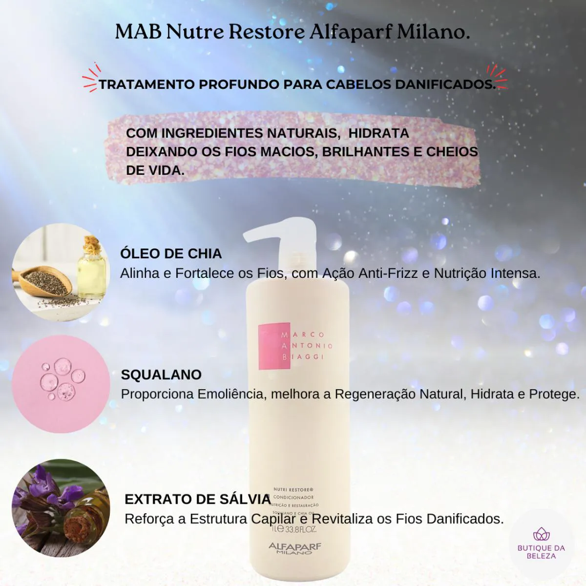 SERVIR E AJUDAR SÃO NOSSOS DEVERES condicionador MAB ALFAPARF MILANO - NUTRI RESTORE Sofrendo com cabelos secos, sem brilho e danificados?! O Condicionador Mab Nutri Restore é a solução perfeita para revitalizar seus fios, devolvendo a maciez, o brilho e a vitalidade. Sinta a transformação de um cabelo saudável e radiante com o Condicionador MAB Nutri Restore.