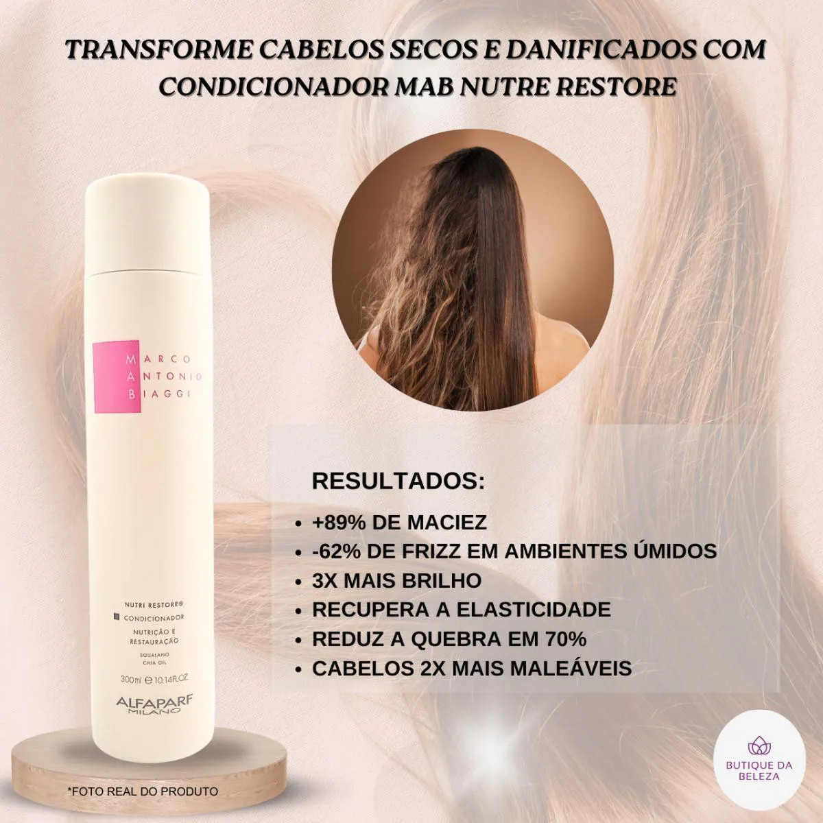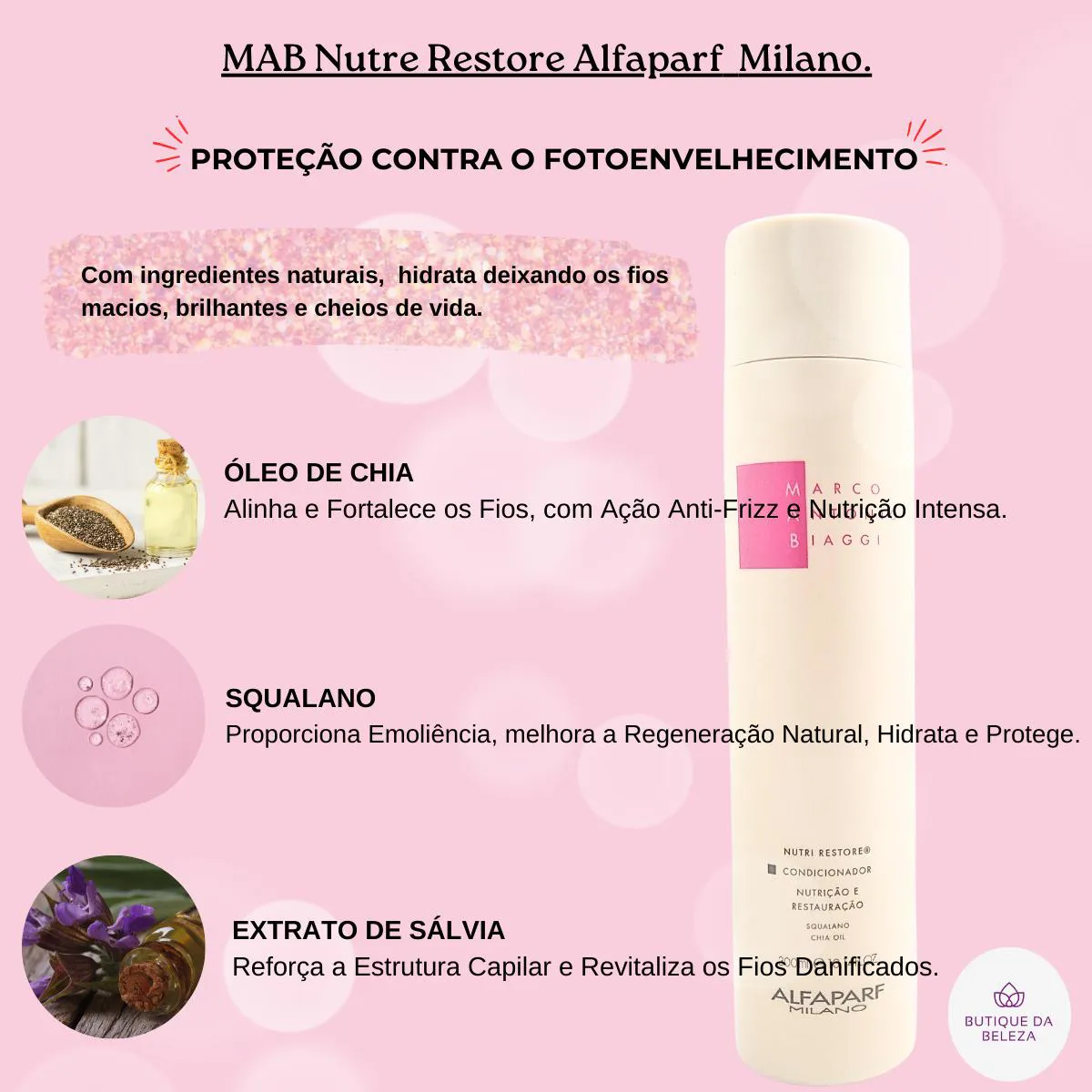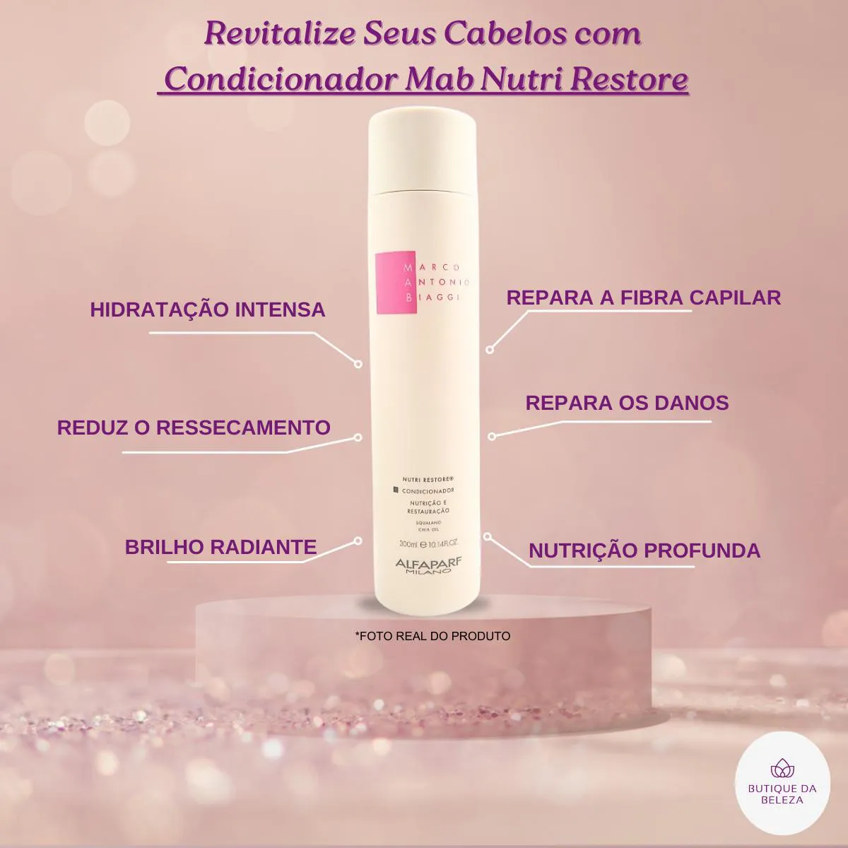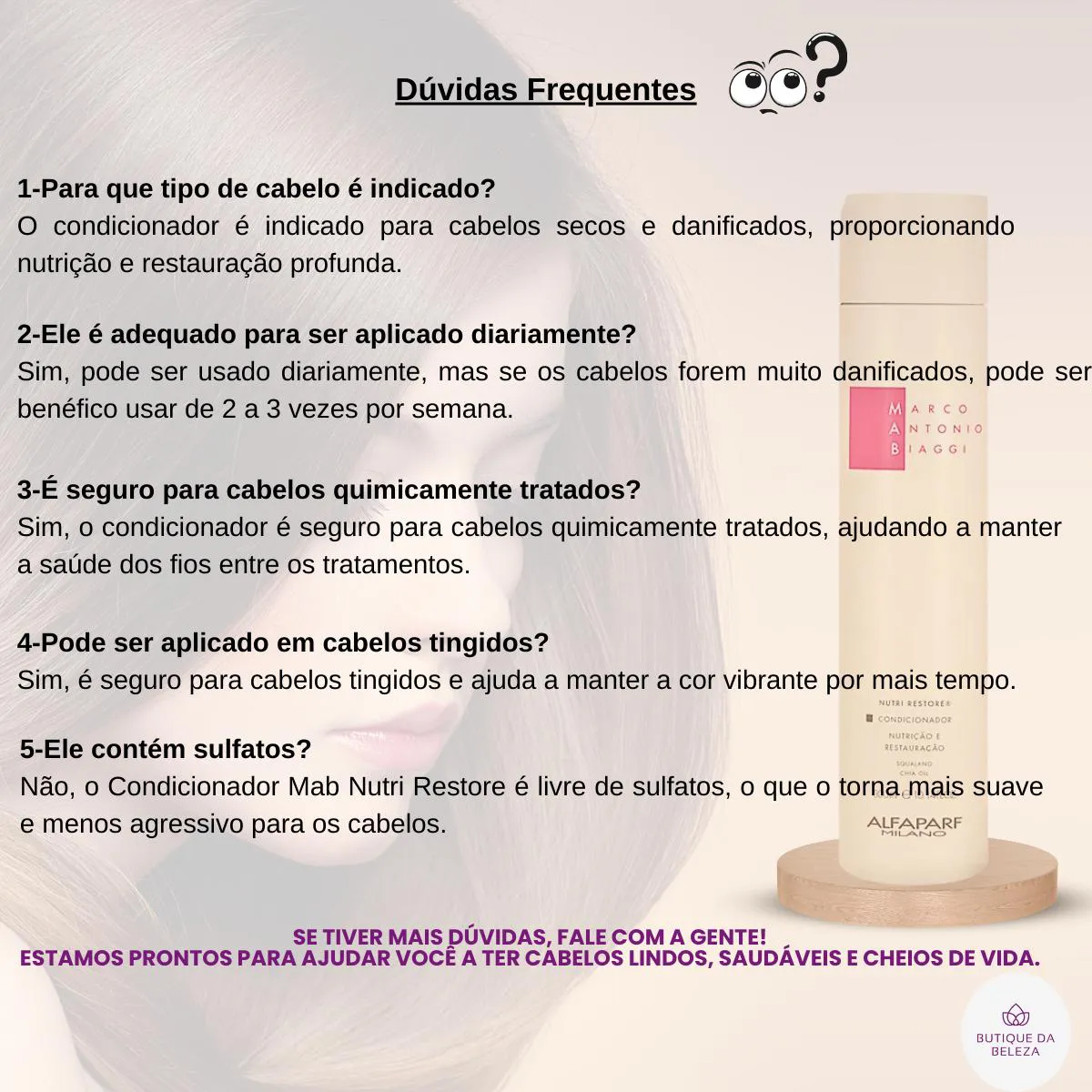 SERVIR E AJUDAR SÃO NOSSOS DEVERES condicionador MAB ALFAPARF MILANO - NUTRI RESTORE Sofrendo com cabelos secos, sem brilho e danificados?! O Condicionador Mab Nutri Restore é a solução perfeita para revitalizar seus fios, devolvendo a maciez, o brilho e a vitalidade. Sinta a transformação de um cabelo saudável e radiante com o Condicionador MAB Nutri Restore.