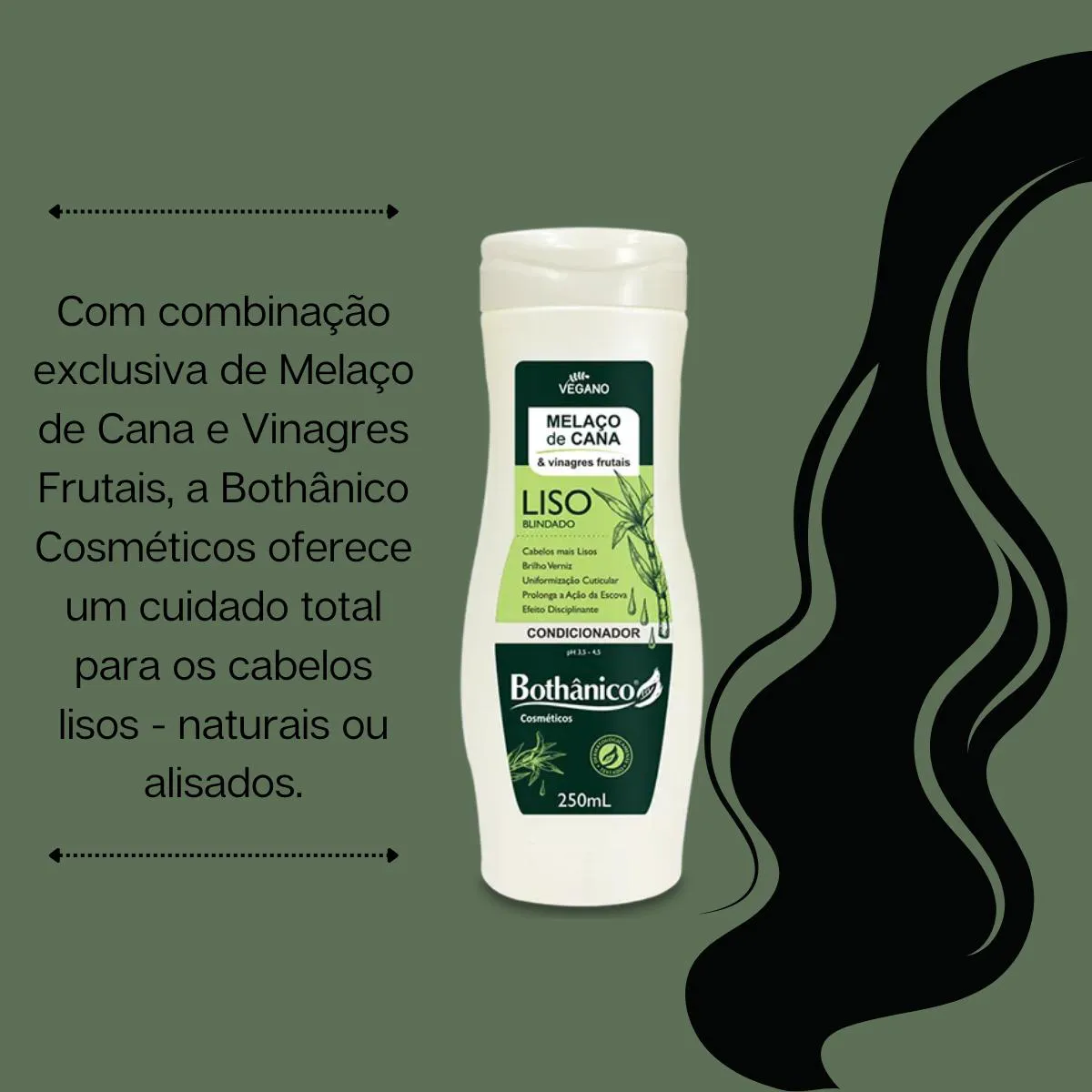 Com combinação exclusiva de Melaço de Cana e Vinagres Frutais, a Bothânico Cosméticos oferece cuidado total para os cabelos lisos - naturais ou alisados. O melaço de cana puro, extraído da cana-de-açúcar, é rico em minerais e açúcares que auxiliam na hidratação e na selagem dos fios. Os vinagres frutais, obtidos da maçã, do limão e do tamarindo, contém antioxidantes e ácidos que reequilibram o pH da cutícula, promovendo alinhamento e efeito disciplinante.