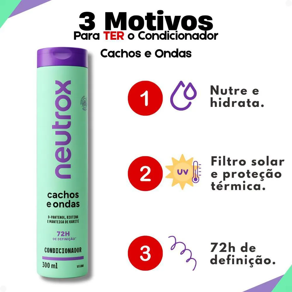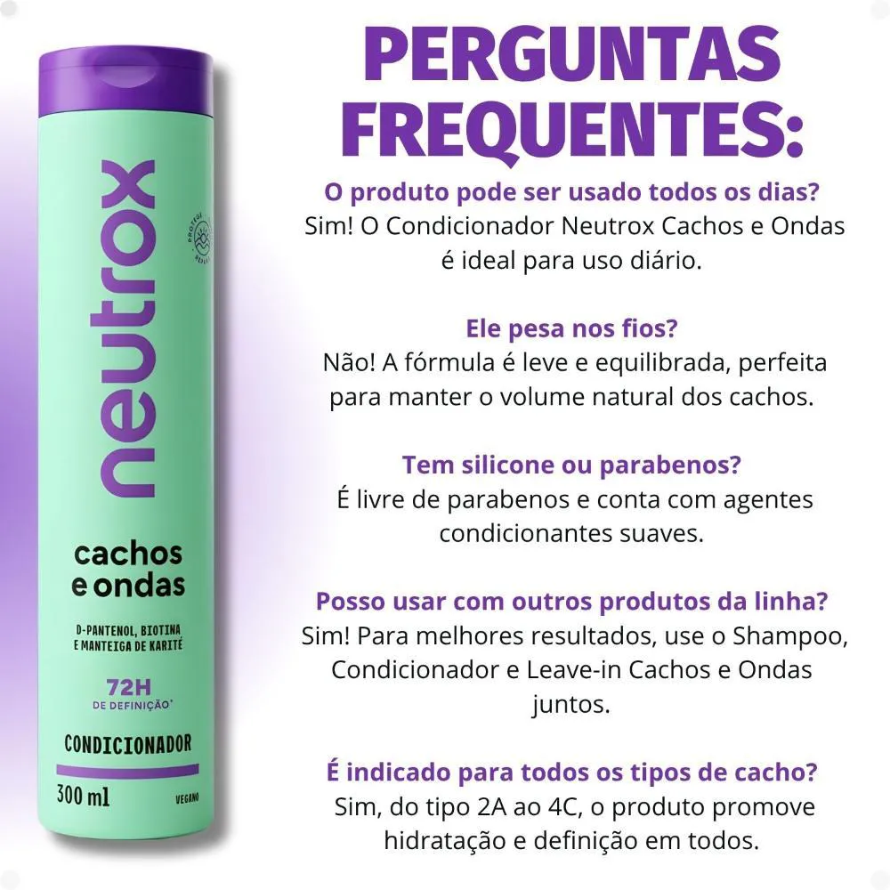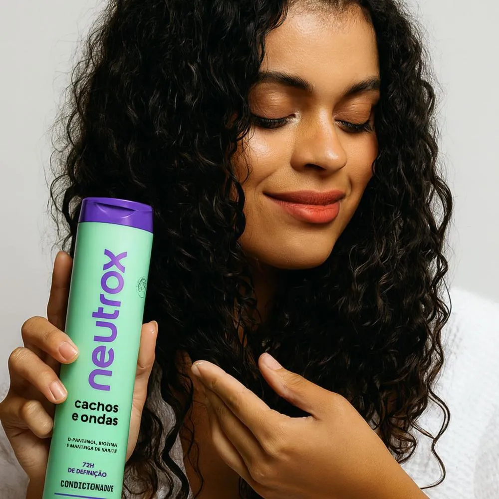 O Condicionador Neutrox Cachos e Ondas 300ml é a escolha perfeita para quem busca um cuidado especial para cabelos cacheados e ondulados. Desenvolvido pela Neutrox, este condicionador oferece uma solução completa para as necessidades dos seus fios, garantindo beleza e saúde. Sua fórmula exclusiva, enriquecida com D-Pantenol, Biotina e Manteiga de Karité, atua selando as cutículas e promovendo uma hidratação profunda. O resultado são cachos e ondas com definição por até 72 horas, macios e com brilho intenso.Benefícios Principais