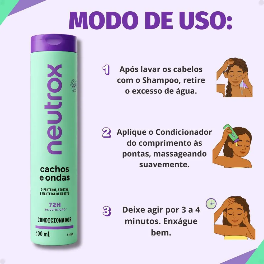O Condicionador Neutrox Cachos e Ondas 300ml é ideal para o uso diário, proporcionando o cuidado essencial para manter a saúde e a beleza de cabelos cacheados e ondulados. Perfeito para quem busca praticidade e resultados duradouros na definição e hidratação dos fios.Modo de Uso/Aplicação