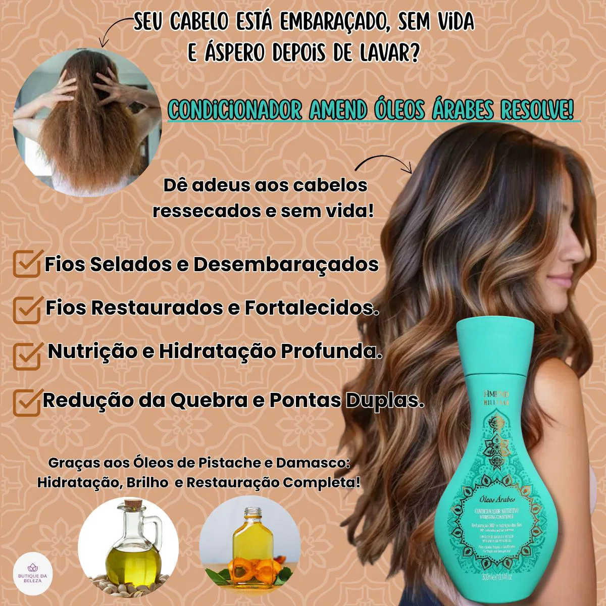 Seu cabelo está embaraçado, sem vida e áspero depois de lavar? O Condicionador Nutritivo Amend Millenar Óleos Árabes é o passo essencial que você precisa para transformar seus fios. Inspirado nos rituais milenares de beleza do Oriente Médio, ele promove uma restauração 360º, combinando nutrição profunda, hidratação intensa e reconstrução dos fios danificados, tudo isso com uma fragrância maravilhosa inspirada na perfumaria árabe. Além disso, protege contra agressões externas, reduz o volume e fortalece os cabelos, prevenindo a quebra e as pontas duplas. Sua fórmula rica em Óleo de Damasco, Óleo de Pistache e exclusivo Mass Replenish Complex (repositor de massa capilar) oferece uma experiência completa de restauração capilar. Dê adeus aos cabelos ressecados e sem vida!