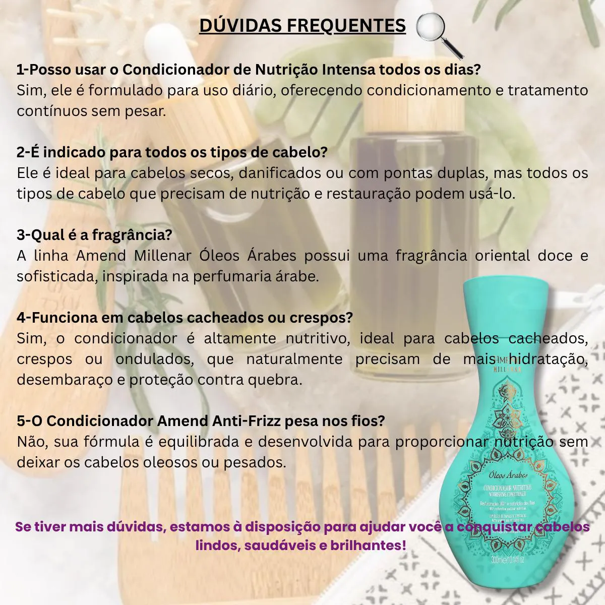 DÚVIDAS FREQUENTES 1-Posso usar o Condicionador de Nutrição Intensa todos os dias? Sim, ele é formulado para uso diário, oferecendo condicionamento e tratamento contínuos sem pesar. 2-É indicado para todos os tipos de cabelo? Ele é ideal para cabelos secos, danificados ou com pontas duplas, mas todos os tipos de cabelo que precisam de nutrição e restauração podem usá-lo. 3-Qual é a fragrância? A linha Amend Millenar Óleos Árabes possui uma fragrância oriental doce e sofisticada, inspirada na perfumaria árabe. 4-Funciona em cabelos cacheados ou crespos? Sim, o condicionador é altamente nutritivo, ideal para cabelos cacheados, crespos ou ondulados, que naturalmente precisam de mais hidratação, desembaraço e proteção contra quebra. 5-O Condicionador Amend Anti-Frizz pesa nos fios? Não, sua fórmula é equilibrada e desenvolvida para proporcionar nutrição sem deixar os cabelos oleosos ou pesados.