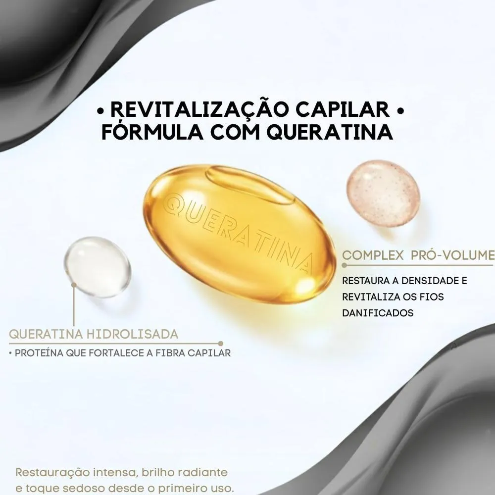 Cabelos limpos, reconstruídos e fortalecidos, com toque sedoso, brilho saudável e aparência reparada.