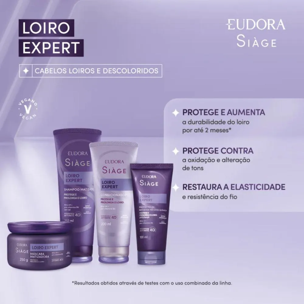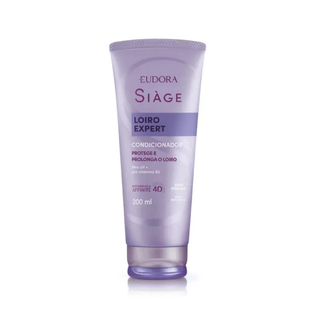 O Condicionador Siàge Loiro Expert é ideal para cabelos loiros, descoloridos ou com mechas. Com Filtro UV e Pro-vitamina B5, protege os fios da oxidação e prolonga a cor por até 2 meses.