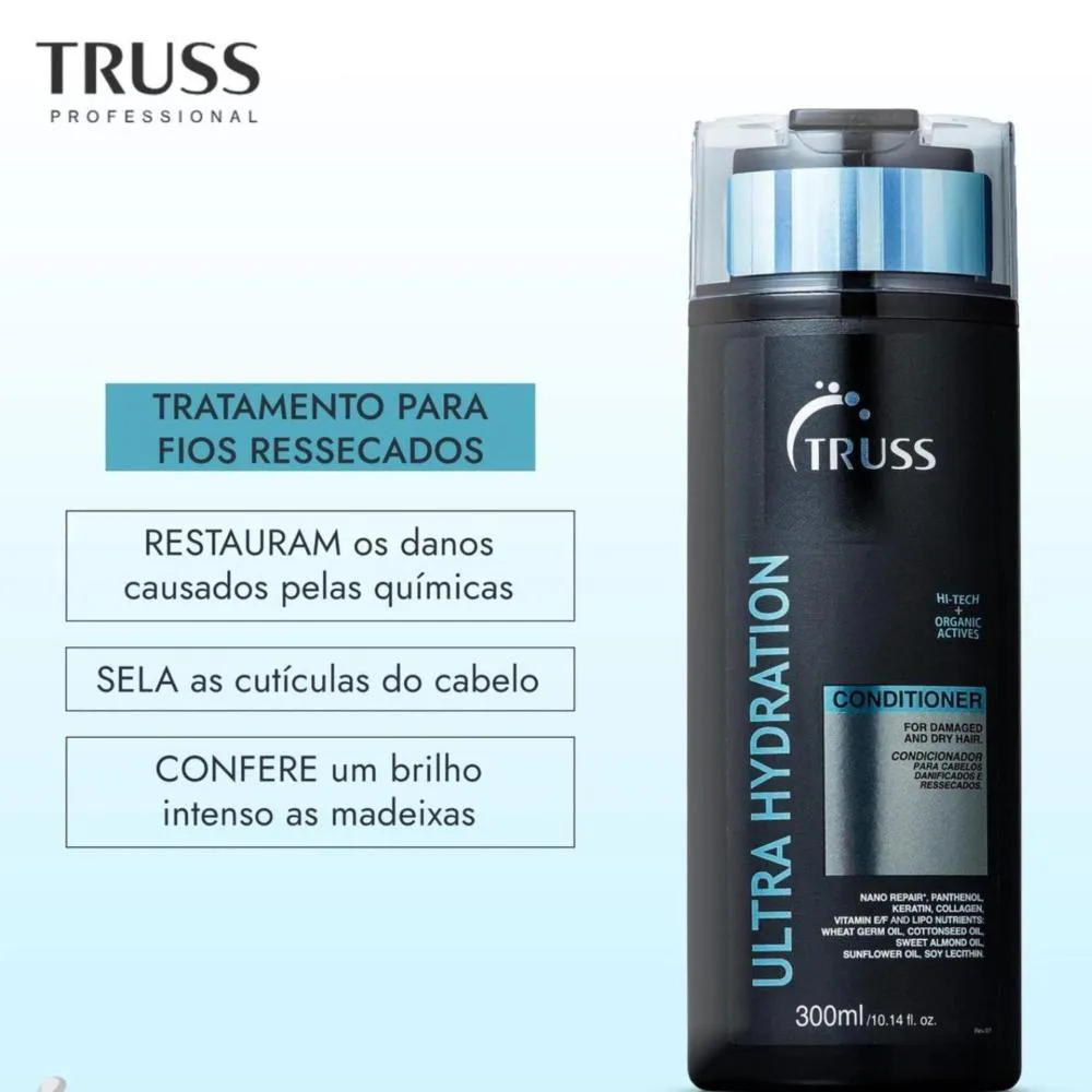 O condicionador Truss Ultra Hydration 300 ml é o tratamento ideal para repor a hidratação perdida e devolver a vitalidade dos cabelos secos, opacos e ressecados.
