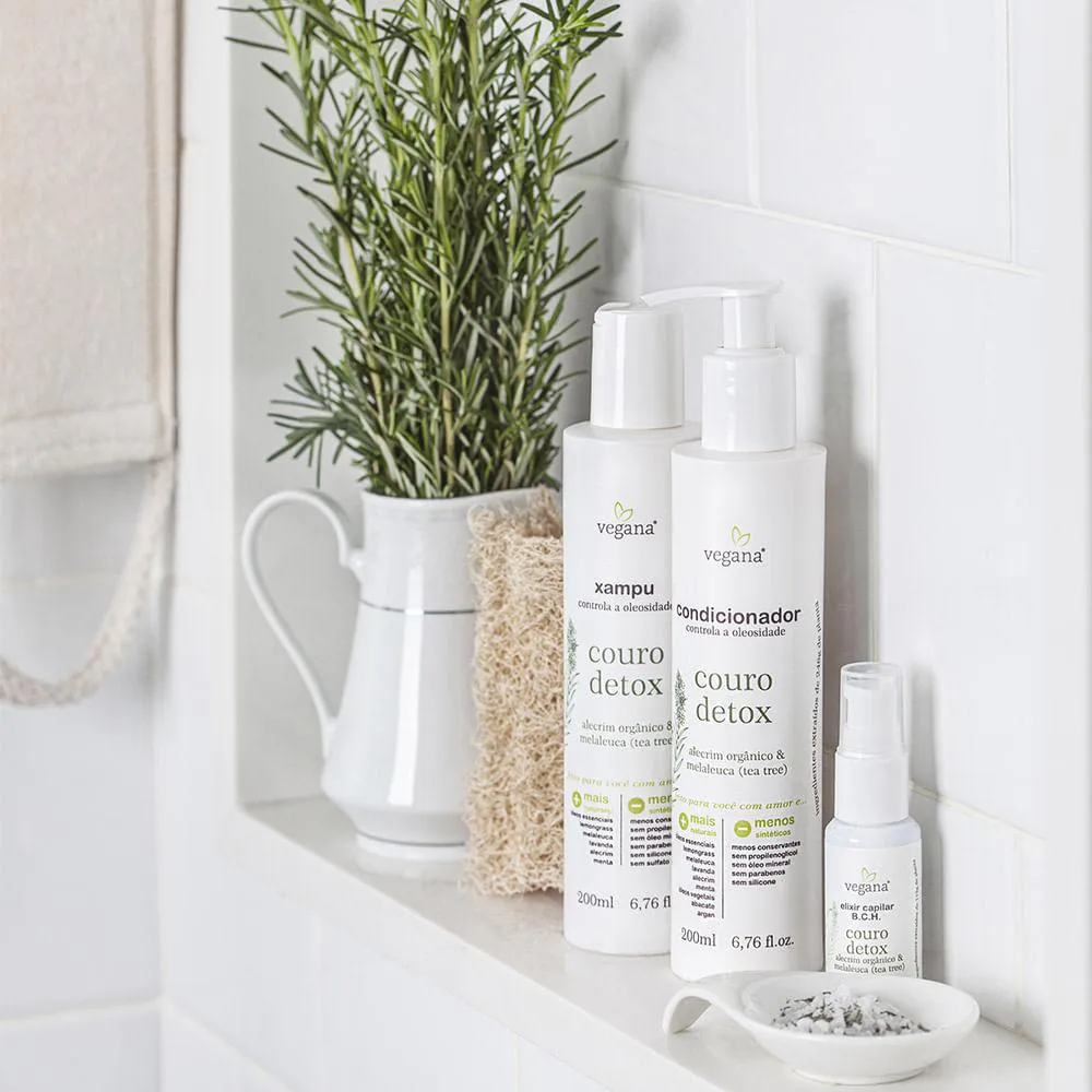 Aplicar nos cabelos molhados durante o banho. Em seguida retirar no banho e, para melhores resultados, aplicar o Elixir e Xampu vegana Couro Detox.