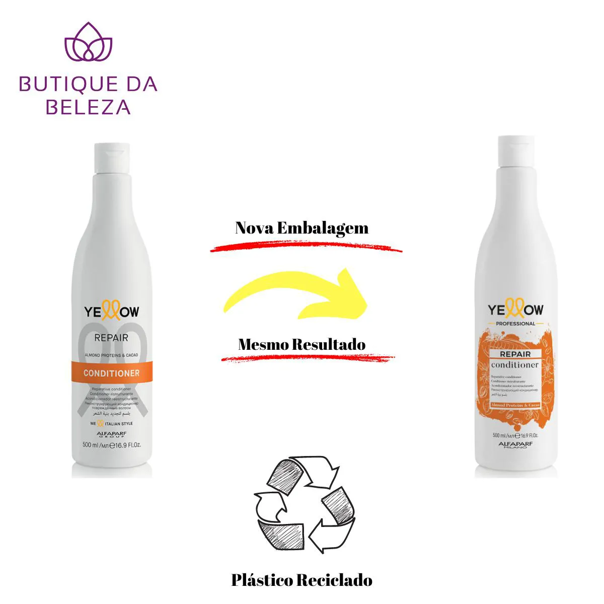 Somos a BUTIQUE DA beleza Uma empresa especializada no comércio de Cosméticos e Semijoias. Estamos sempre entre os Melhores Vendedores. NOSSO COMPROMISSO É COM VOCÊ! SEU CONFORTO E SEGURANÇA SÃO NOSSOS PROPÓSITOS SERVIR E AJUDAR SÃO NOSSOS DEVERES Apresentação da Linha YELLOW REPAIR A recarga de energia certa para os cabelos! A LINHA YELLOW PARA CABELOS danificados E EXTREMAMENTE DANIFICADOS, PERFEITA PARA: 1. REPARAR EM PROFUNDIDADE 2. PROTEGER DURANTE OS TRABALHOS TÉCNICOS 3. PERSONALIZAR OS tratamentos CARE UMA FONTE DE ENERGIA DIRETAMENTE DA NATUREZA PROTElNAS DA AMÊNDOA - GRAÇAS AO SEU BAIXO PESO MOLECULAR, PENETRAM NAS CAMADAS MAIS PROFUNDAS DA FIBRA INTERAGINDO COM A QUERATINA DO cabelo E CRIANDO NOVAS LIGAÇÕES. MANTEIGA DE CACAU - OS ÁCIDOS GRAXOS NELE CONTIDOS TRABALHAM NA ESTRUTURA LIPÍDICA RESTITUINDO NUTRIÇÃO E COMPACTAÇÃO À CUTÍCULA. RESULTADOS?! CABELOS 86% MAIS FORTES* condicionador YELLOW REPAIR Condicionador reestruturador para cabelos danificados TEXTURAS MODULÁVEL IDEAL PARA UM DUPLO USO! COM ENXÁGUE: PERFEITO PARA OS CABELOS FINOS QUE PROCURAM REPARO SEM RENUNCIAR À LEVEZA. COMO LEAVE-IN: ÓTIMO PARA CABELOS NORMAIS E/OU GROSSOS QUE PROCURAM UMA REPARAÇÃO 24H*. MODO DE USO COM O CABELO ÚMIDO, APLICAR NO COMPRIMENTO E PONTAS. DEIXAR ATUAR DURANTE 2/3 MINUTOS E DEPOIS ENXAGUAR. SE USADO COMO LEAVE-IN, APLICAR NOS CABELOS SECOS COM TOALHA E ENTÃO PROCEDER AO STYLING. EMBALAGEM FRASCO 500 ML