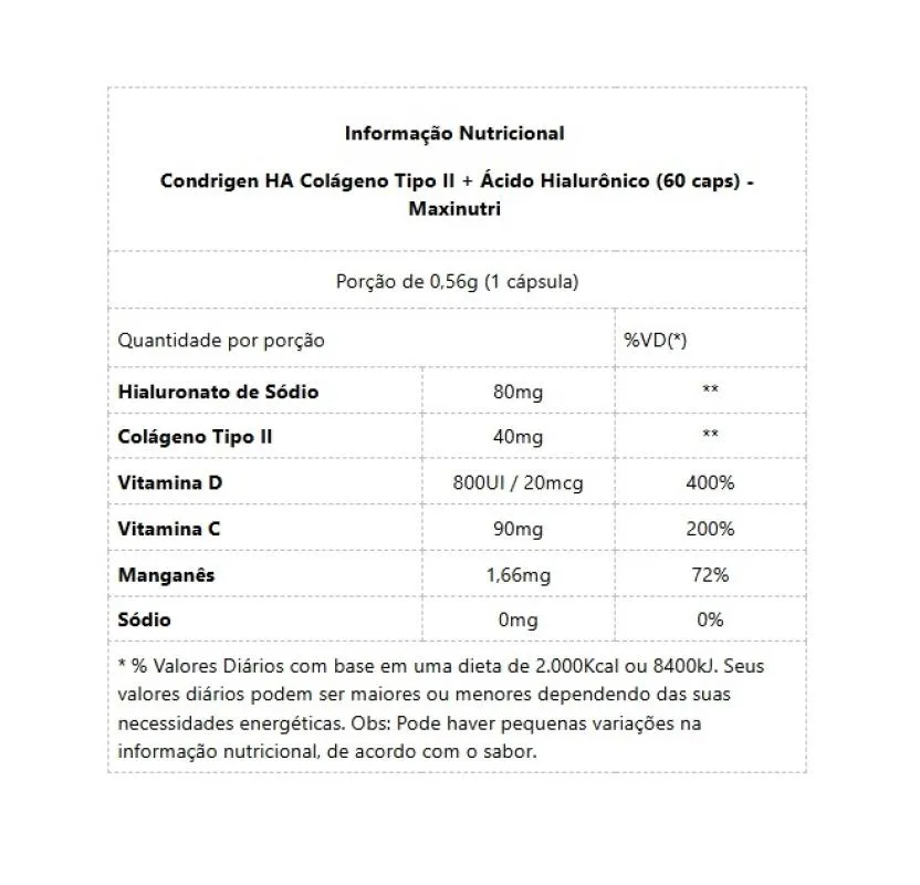 Condrigen HA colágeno Tipo II + Ácido Hialurônico (30 caps) - Maxinutri Condrigen HA Colágeno Tipo II + Ácido Hialurônico (60 caps) Maxinutri é uma combinação de ácido Hialurônico biodisponível com o colágeno não hidrolisado tipo II com a tecnologia UC II associados às vitamina c, D 3 e o mineral manganês. O Colágeno Tipo II é voltado exclusivamente para saúde das articulações (cartilagens) e ossos, uma vez que estão diretamente relacionados com a firmeza e sustentação destes, obtendo assim flexibilidade e mobilidade. Com o avançar da idade, há uma redução da produção de Colágeno Tipo II, e assim há o aparecimento de dores ósseas e articulares, sendo indicado sua reposição por suplementação. O ácido Hialurônico está naturalmente presente em tecidos e articulações porém com o tempo, sua presença diminui Sua reposição é importante pois promove a manutenção da saúde articular através da hidratação e lubrificação devido a sua capacidade de atrair grandes quantidades de água para os tecidos.