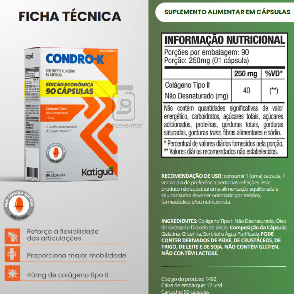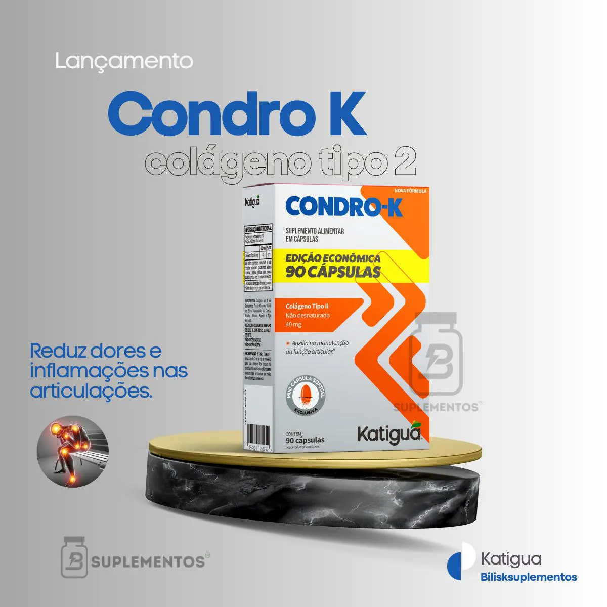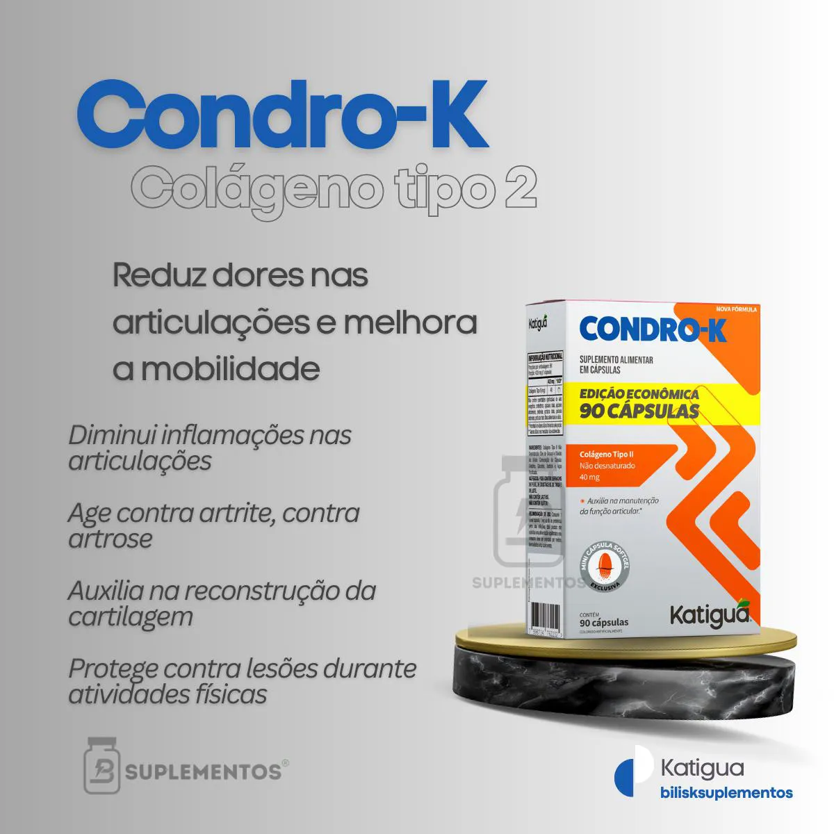 Suplemento alimentar em cápsulas formulado com colágeno tipo II não desnaturado, desenvolvido para auxiliar na manutenção da saúde das articulações.Benefícios: