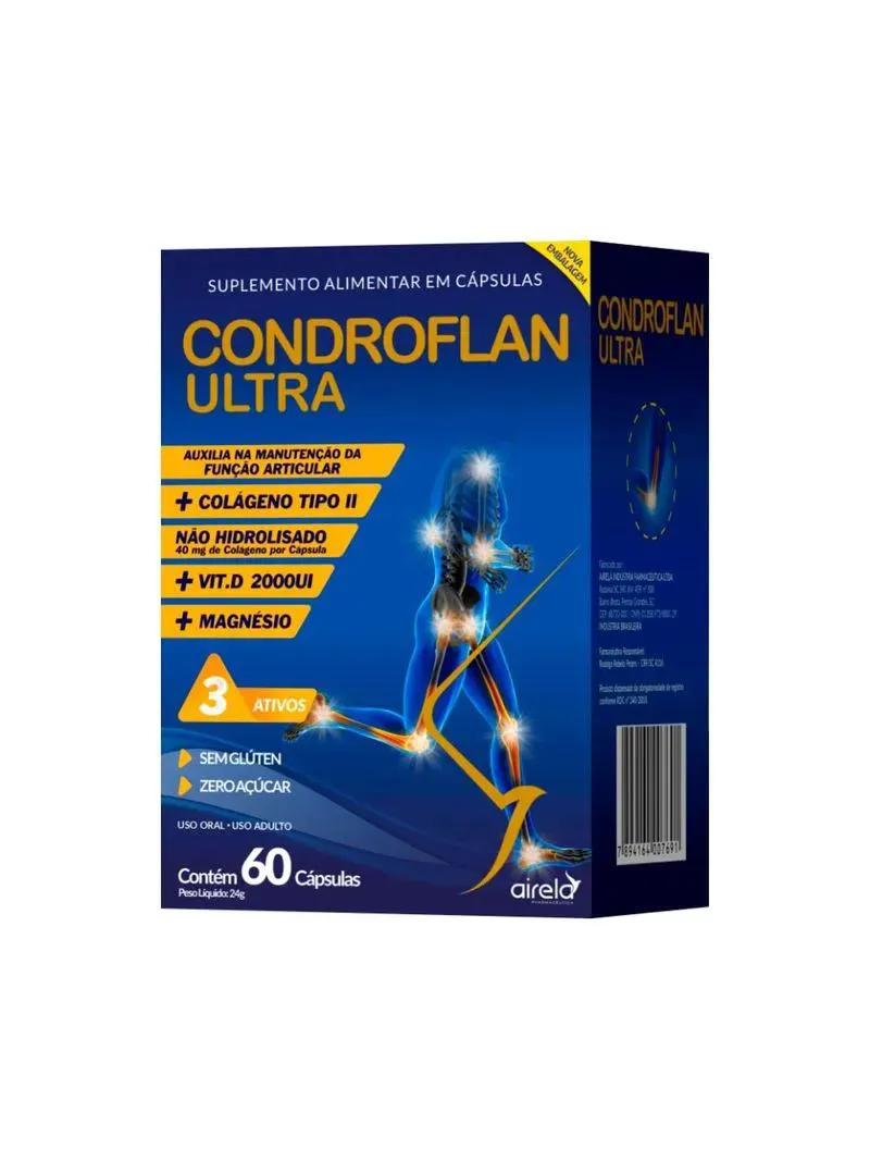 Suplemento Alimentar Condroflan Ultra – 60 CápsulasO Condroflan Ultra é um suplemento alimentar desenvolvido para cuidar da saúde das articulações, ossos e músculos, promovendo mais conforto e mobilidade no dia a dia. Sua fórmula avançada combina colágeno Tipo II, vitamina D3 e Magnésio, nutrientes essenciais que atuam em conjunto para manter a integridade das cartilagens, fortalecer os ossos e auxiliar no bom funcionamento muscular.Ideal para quem busca preservar a flexibilidade e prevenir o desgaste articular, o Condroflan Ultra ajuda a manter a vitalidade e o bem-estar em todas as fases da vida.Benefícios: