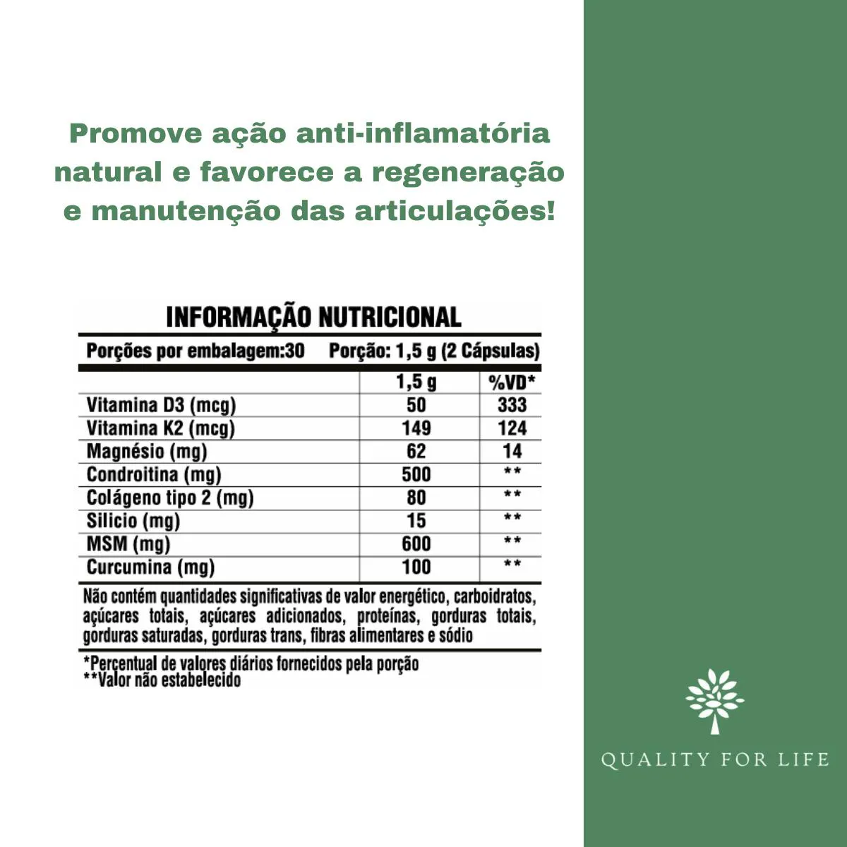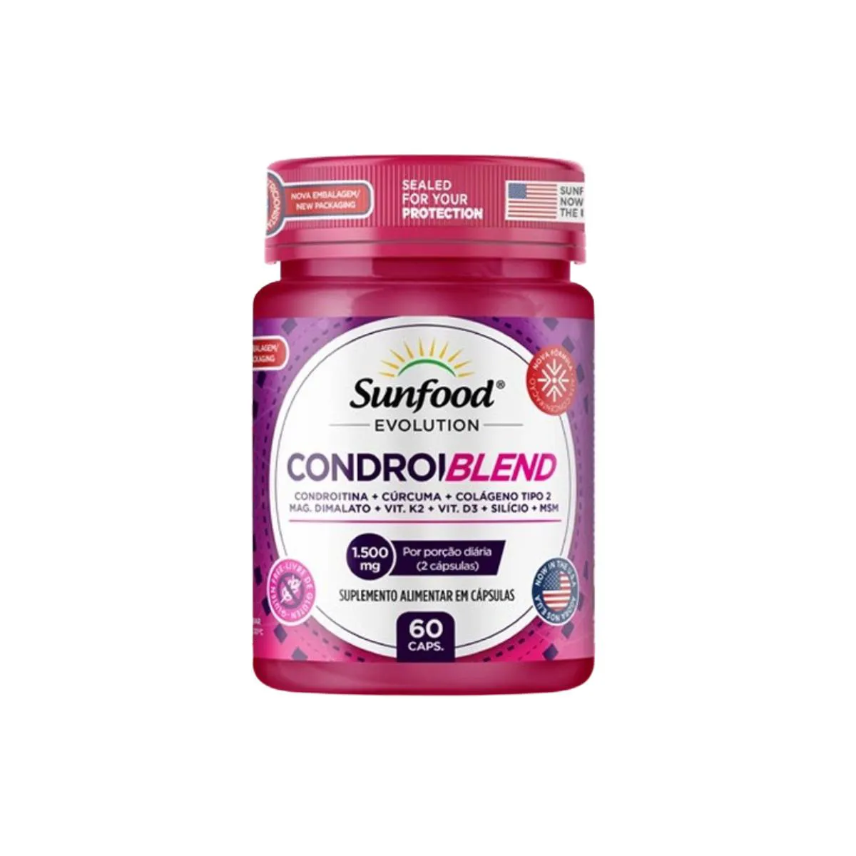 Produto: Condroiblend: Condroitina + cúrcuma + colágeno tipo 2 + magnésio dimalato + k2 + D3 + Silicio + MSM 1500mg por porção Quantidade: 60 cápsulas Fabricante: S. Evolution ___________ Benefícios: Cuidado das articulações e cartilagens. Sua fórmula reúne ativos consagrados como MSM, sulfato de condroitina (obtido por fermentação), cúrcuma, colágeno tipo 2 e magnésio, aliados às vitaminas K2 (menaquinona-7) e D3, além de ácido ortosilícico estabilizado. Uma combinação estratégica que auxilia na redução de desconfortos articulares, promove ação anti-inflamatória natural e favorece a regeneração e manutenção das articulações. ___________ Descrição: Uma nutrição equilibrada tem um papel muito importante na qualidade de vida. Com o ritmo acelerado de muitas pessoas, às vezes, é muito difícil prestar atenção a todos os requisitos que o corpo precisa para estar saudável e forte. Neste sentido, os suplementos cumprem a função de complementar a alimentação e ajudam a obter as vitaminas, minerais, proteínas e outros componentes indispensáveis para o correto funcionamento do organismo. Esse tipo de suplemento pode ser usado para prevenir deficiências alimentares causadas por alguma patologia ou circunstância específica, além de colaborar com a saúde e o bem-estar geral. É importante destacar que seu uso deve ser acompanhado por uma dieta equilibrada e hábitos de vida saudáveis. *Este produto é um suplemento dietético, não é um medicamento. Suplementa Ante dietas insuficientes. Consulte seu médico e / ou profissional qualificado. ___________ Ingredientes: Metilsulfonilmetano (MSM), sulfato de Condroitina produzido a partir da fermentação de Escherichia coli, extrato de rizomas de cúrcuma longa, colageno tipo 2, malato de magnésio, menaquinona-7, colecalciferol, ácido ortosilícico estabilizado em cloreto de colina. Antiumectantes: dióxido de silício coloidal, estearato de magnésio e carbonato de cálcio. Composição da cápsula: gelatina e água Purificada. Agente de massa: glicerol. Corante: Dióxido de titânio. ____________ Dosagem e uso: Tomar 2 cápsula com uma refeição. ___________
