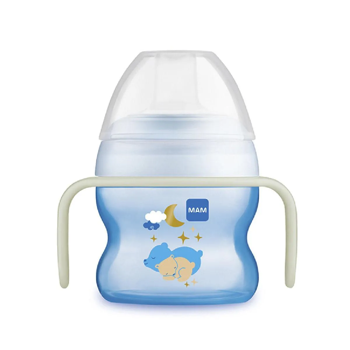 Copo de Transição 150ml Starter Cup Night 4m+ Azul - MAM Começar é fácil. Juntamente com pediatras, os designers da MAM criaram o primeiro copo ideal para crianças pequenas. Os copos de transição MAM se adaptam à boca pequena e à gengiva macia do bebê. Conta com pegas ergonômicas desenvolvivdas para as mãos pequenas do bebê e com bico antivazamento.