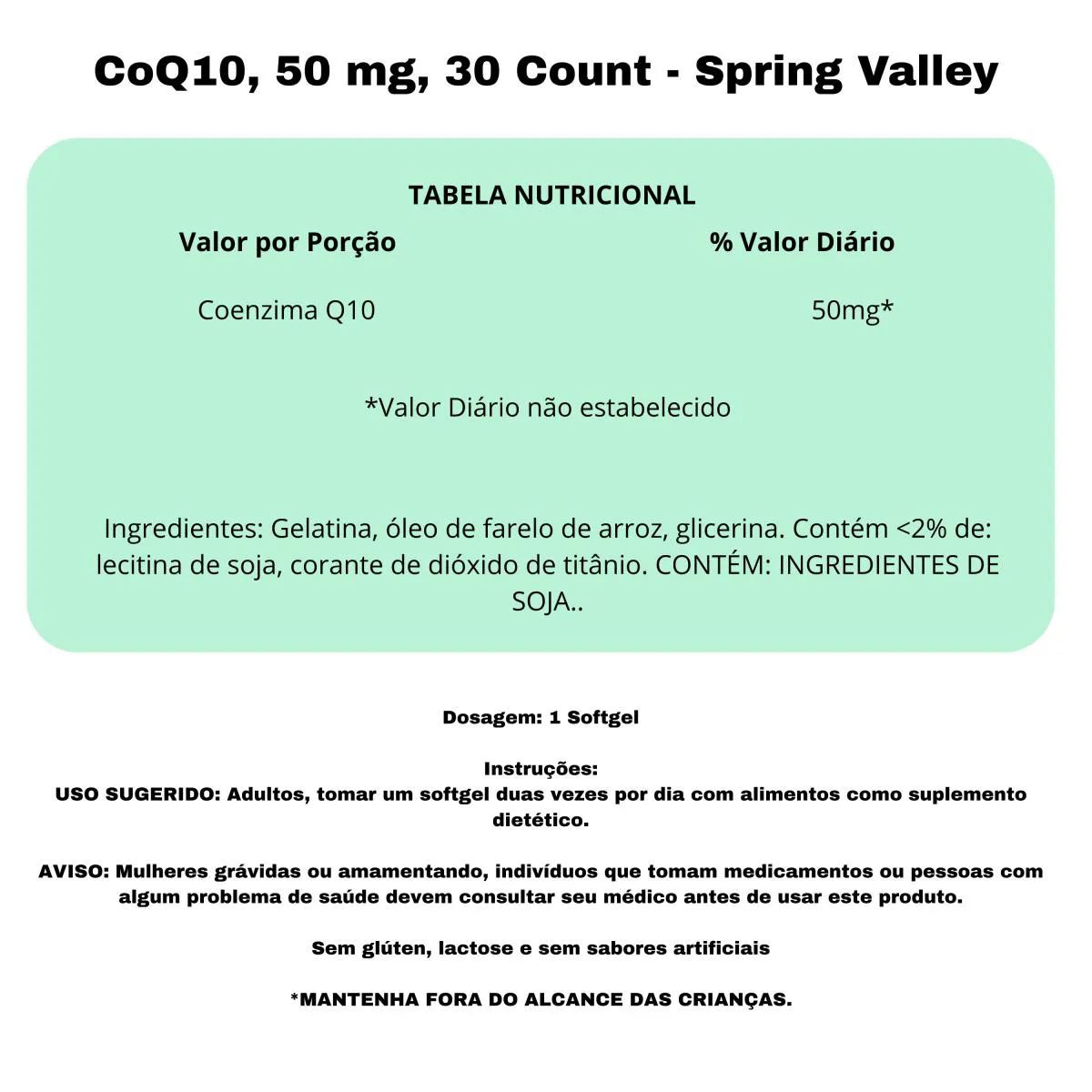 Dosagem: 1 Softgel Instruções:USO SUGERIDO: Adultos, tomar um softgel duas vezes por dia com alimentos como suplemento dietético. AVISO: Mulheres grávidas ou amamentando, indivíduos que tomam medicamentos ou pessoas com algum problema de saúde devem consultar seu médico antes de usar este produto. Sem glúten, lactose e sem sabores artificiais *MANTENHA FORA DO ALCANCE DAS CRIANÇAS.