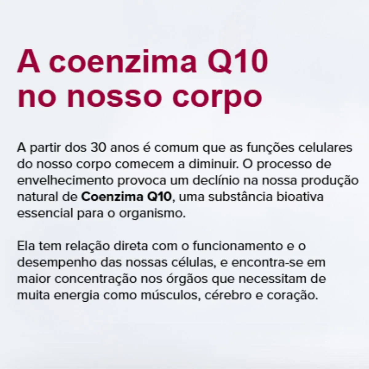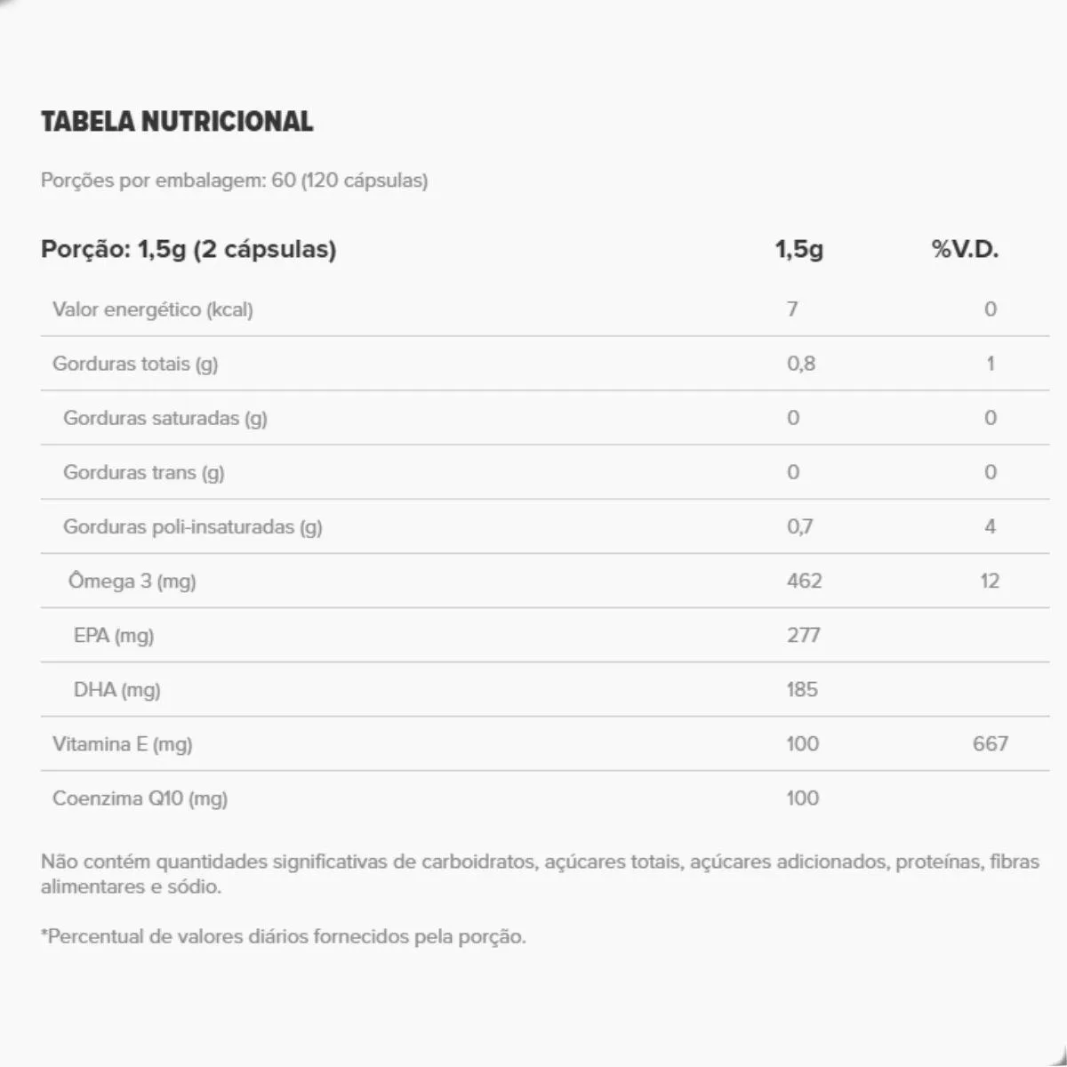 A formulação prioriza a coenzima Q10 obtida por fermentação, o óleo de peixe concentrado e livre de metais pesados na forma TG, que facilita a digestibilidade, e a vitamina e extraída de fontes naturais. Não contém aditivos artificiais, açúcar ou glúten, refletindo o compromisso da marca com matérias-primas selecionadas.