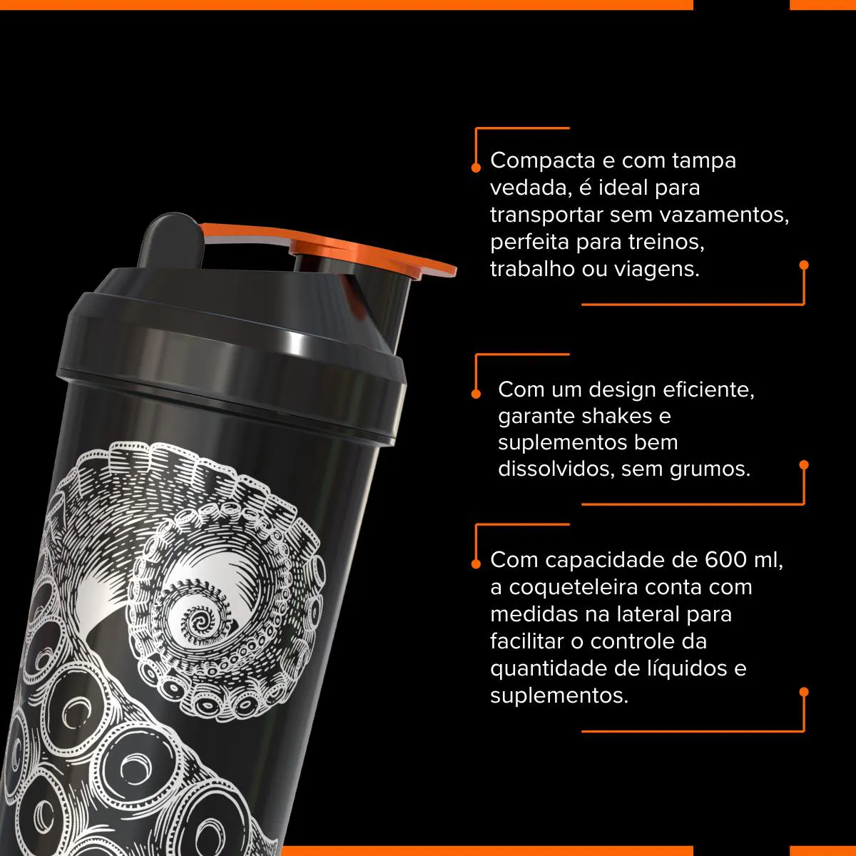 A Coqueteleira GO! foi desenvolvida para quem busca praticidade, eficiência e segurança no preparo de shakes e suplementos no dia a dia. Com design funcional e estrutura resistente, é ideal para treinos, trabalho, viagens ou rotina intensa.Possui tampa vedada, garantindo transporte seguro sem vazamentos, além de um sistema eficiente de agitação que ajuda a dissolver suplementos de forma homogênea, evitando grumos e resíduos. Seu formato compacto facilita o manuseio e o armazenamento.Com capacidade de 600 ml, conta com marcações laterais que auxiliam no controle preciso da quantidade de líquidos e suplementos, tornando o preparo rápido e prático em qualquer situação.Produto indicado para uso diário no preparo de shakes, suplementos e bebidas diversas.