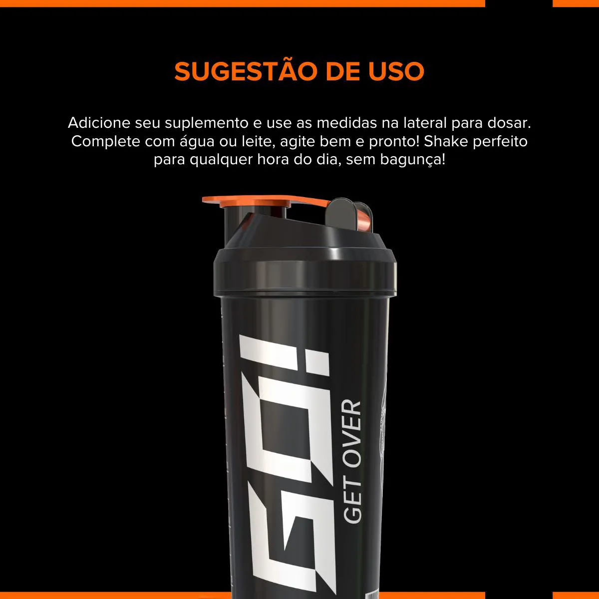 Adicionar o suplemento desejado, completar com água ou leite conforme a recomendação do produto, fechar bem a tampa e agitar até completa dissolução. Material resistente, reutilizável e de fácil higienização.