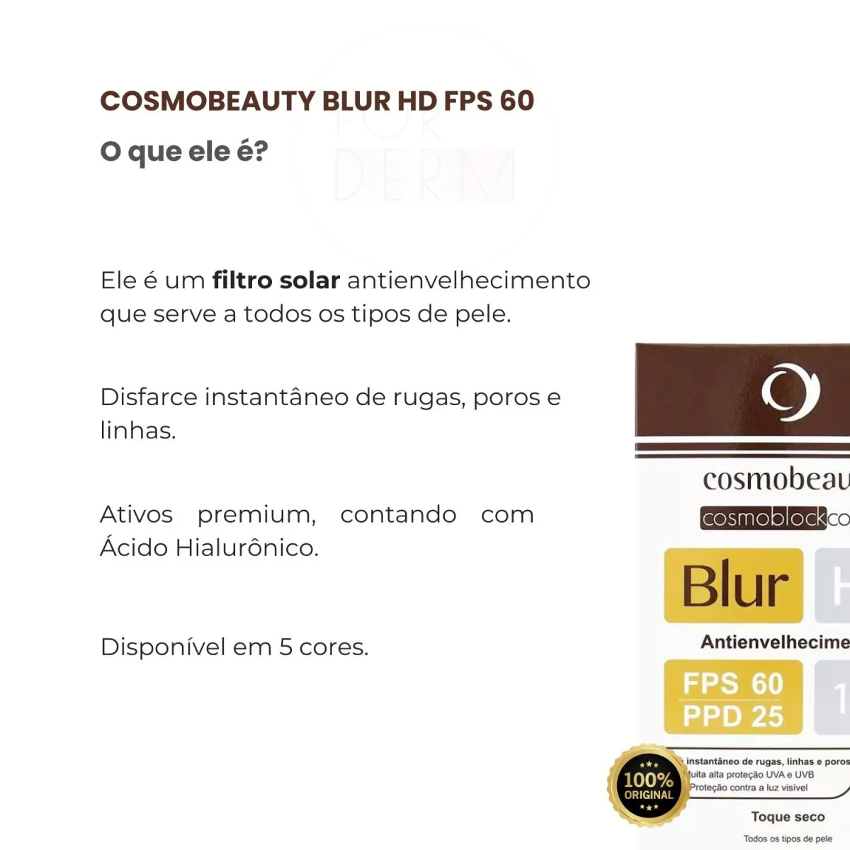 CARACTERÍSTICAS O Cosmoblock Blur HD Base Corretiva FPS 60 antienvelhecimento é uma base uniformizadora de alta cobertura com textura seca indicada para todos os tipos de pele. Contém um conjunto de substâncias que melhoram o aspecto geral da pele agindo como hidratante, antioxidante e protege duplamente a pele contra os efeitos da poluição. Suas particulas High Tech proporcionam efeito mate e disfarçam as imperfeições cutâneas como: rugas, linhas de expressão, poros dilatados, acnes, hipercromias, cicatrizes e vermelhidão. O uso diário auxilia na prevenção do envelhecimento cutâneo causado pela exposição solar e por fatores ambientais. PRINCIPAIS ATIVOS Partículas Soft Focus High Tech, Carcinina, Ácido Hialurônico, Glycofilm, SymUrban e Active D+. Disponível nas cores: Bege, Bege médio, Bronze e chocolate. MODO DE USO Aplicar uniformemente sobre a pele, e espalhar até completa absorção. Reaplique para maior cobertura ou sempre que necessário. + Proteção Solar + Ação Antipoluição + Ação Antienvelhecimento RESISTENTE A ÁGUA E AO SUOR! Conceito HD: Alta definição em cobertura, efeito natural, alta resistência e aderência! Rentabilidade: Média de 100 aplicações