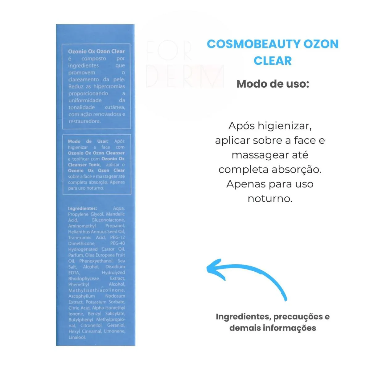 Sobre a face limpa e seca aplicar o Ozonio-Ox Ozon Clear e massagear até completa absorção. Uso Noturno.