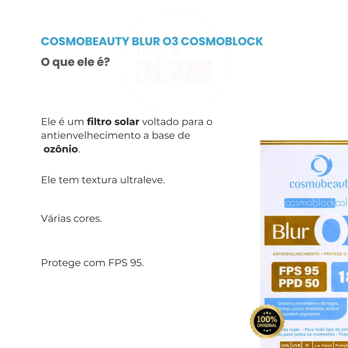 BLUR O3, O queridinho com Ozônio. Composto de ingredientes que possuem ação anti-idade, este Blur é perfeito para o dia a dia, seja no trabalho, em casa ou na atividade física. Sua durabilidade na pele é realmente incrível, são 18 horas prolongadas de proteção! Seu efeito mate mantém a pele linda até o final do dia. Disfarce instantâneo de rugas, linhas, poros dilatados, acne e desordem pigmentar, é BLUR O3. CARACTERÍSTICAS PROTEGE o colágeno com ação antienvelhecimento Tecnologia BIO-ENERGY: Aumento da VITALIDADE celular FPS 95 PPD 50 Proteção Térmica + UVA + UVB Alta resistência à água e ao suor: perfeito para prática de atividades físicas MODO DE USO: Aplicar sobre a pele e massagear preferêncialmente na parte da manhã, após o skin care matutino. BLUR O3 está disponível em 5 cores: NATURAL BEGE BEGE MÉDIO BRONZE chocolate