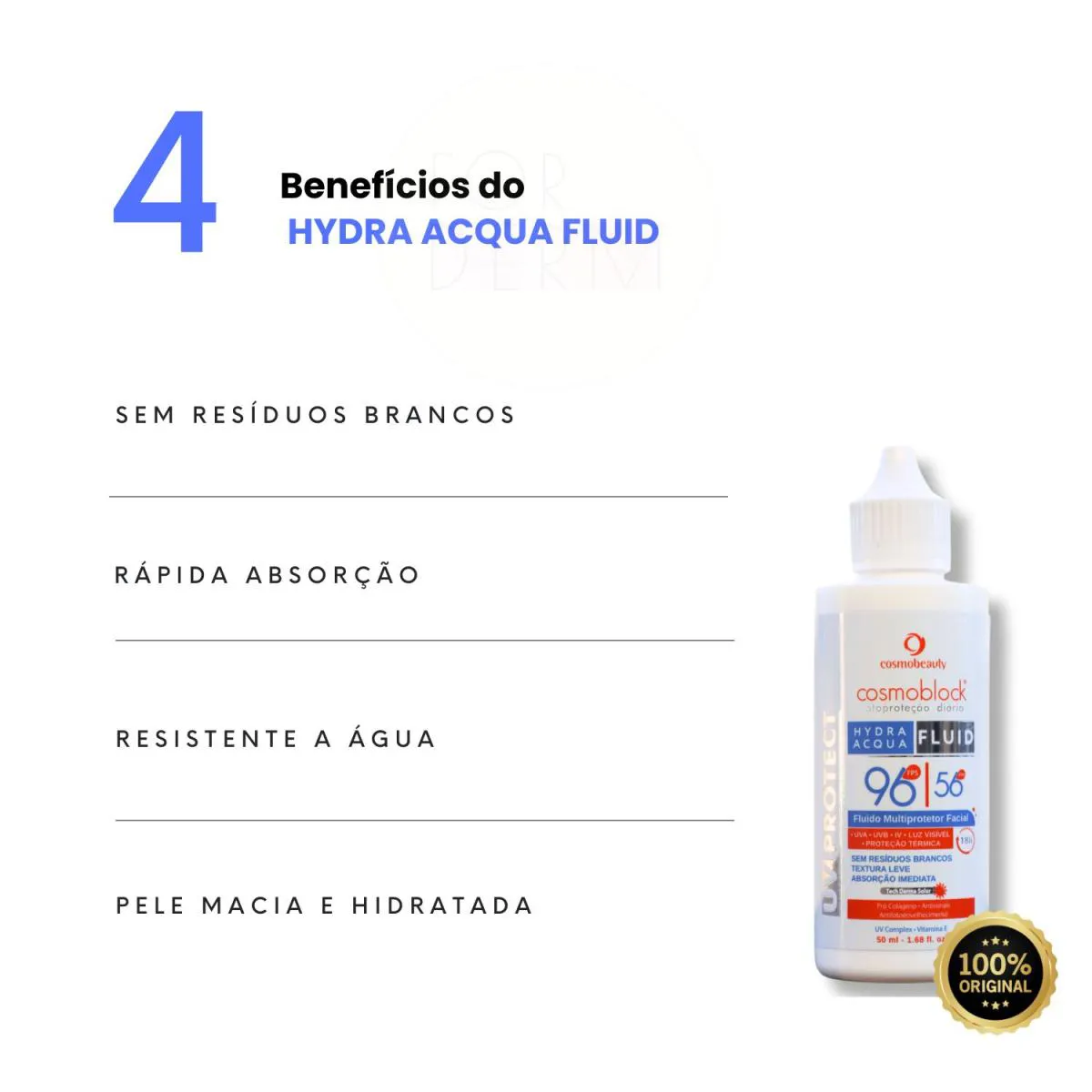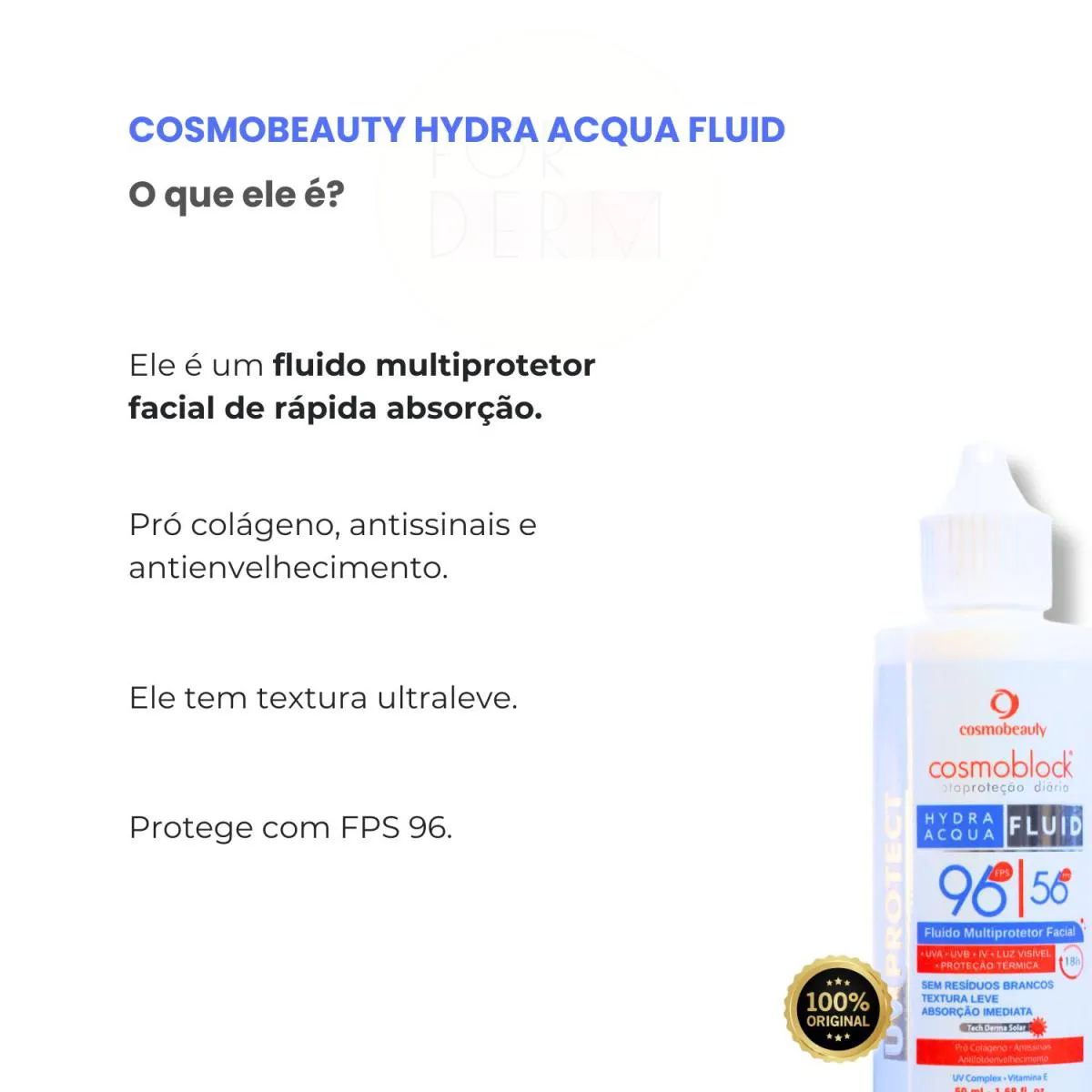 Hydra Acqua Fluid FPS 96 UVProtect Multiprotetor Cosmobeauty protetor solar de amplo espectro, com alta capacidade de fotoproteção frente às radiações solares (uva, uvb, iv e Luz Visível), além de proteção térmica. 18 horas de proteção + textura leve Combate o envelhecimento da pele, através da proteção do colágeno e recupera os danos provocados pela fotoexposição. Tecnologia Derma Solar atua na prevenção do desgaste e envelhicimento cutâneo causado pela fotoexposição da pele. MODO DE USO Agite bem antes de usar. Aplicar diretamente sobre a face e massagear até completa absorção. Reaplicar sempre que desejar. RESULTADOS Pele amplamente protegida e blindada. Amplia a resistência e promove a saúde para os tecidos combatendo intensivamente os danos provocados pelas radiações solares e poluição ambiental. Contribui para a minimização dos sinais do envelhecimento e confere manutenção da firmeza da pele.