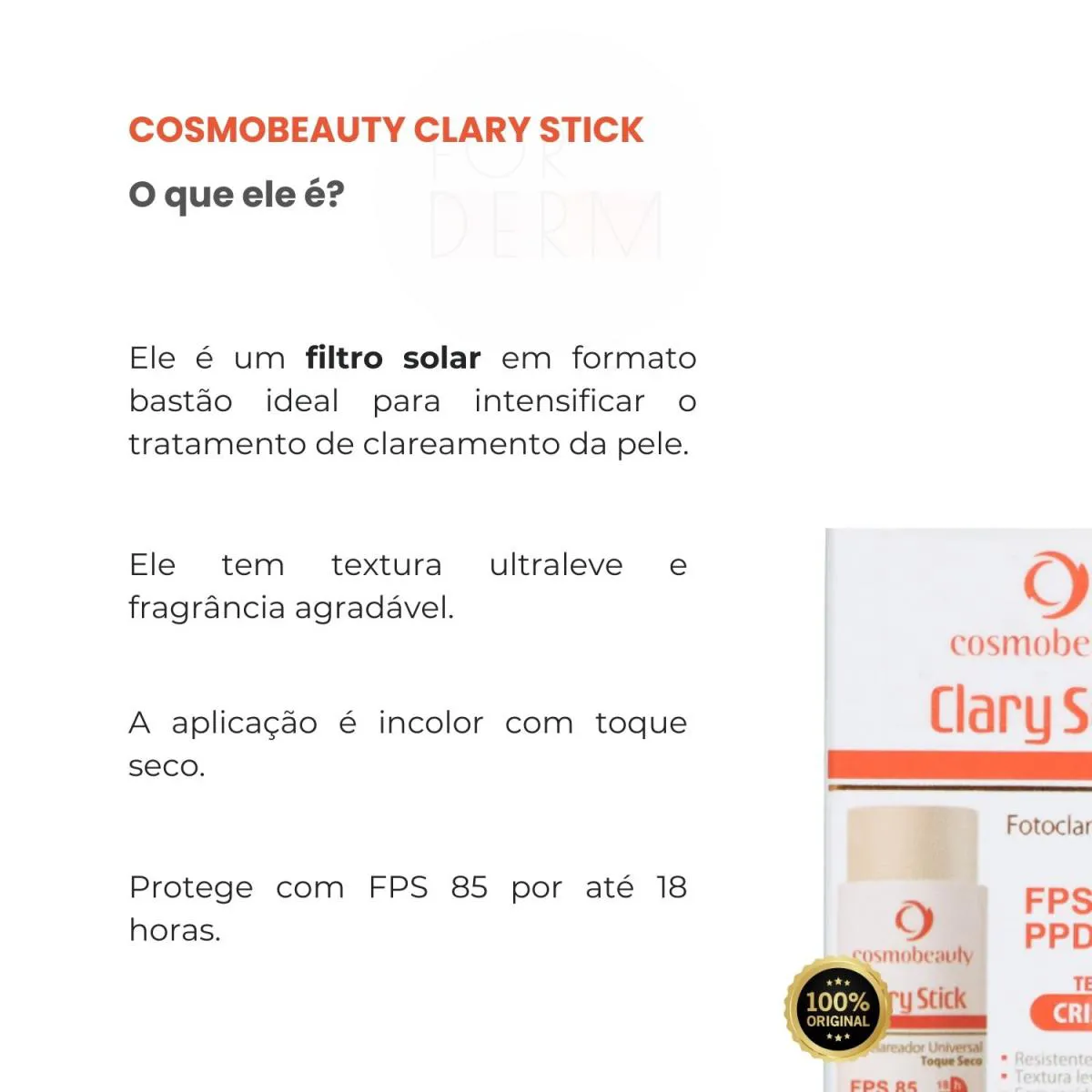 Clary Stick possui ação fotoprotetoras atuando na proteção e clareamento da pele reduzindo as hipercromias cutâneas. FPS 85, 18 horas de proteção!