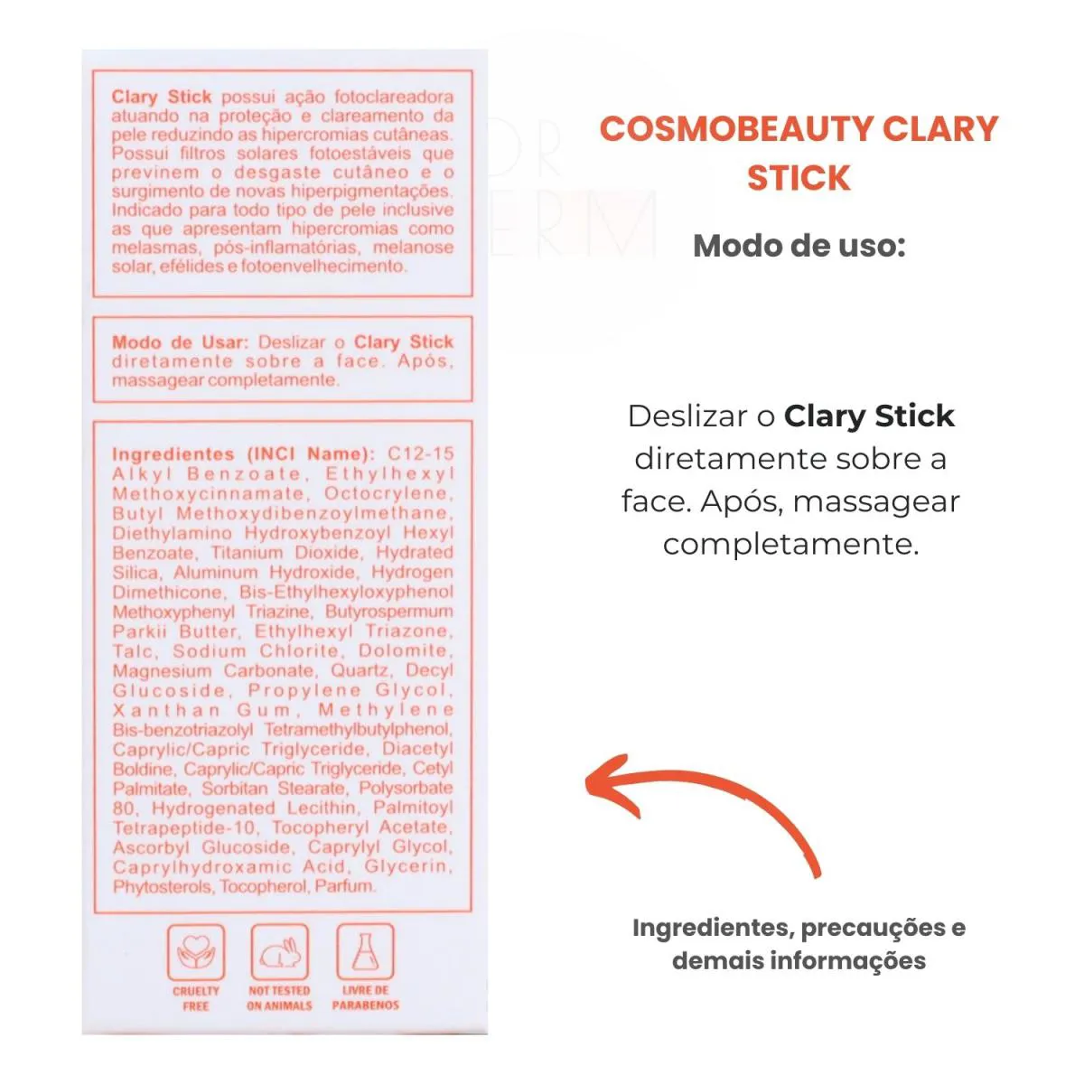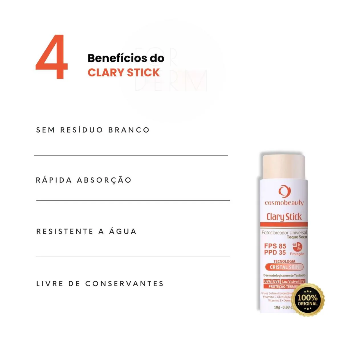 Cosmobeauty Filtro Solar Bastão Clary Stick Toque Seco Clareador Fps 85 18Gr