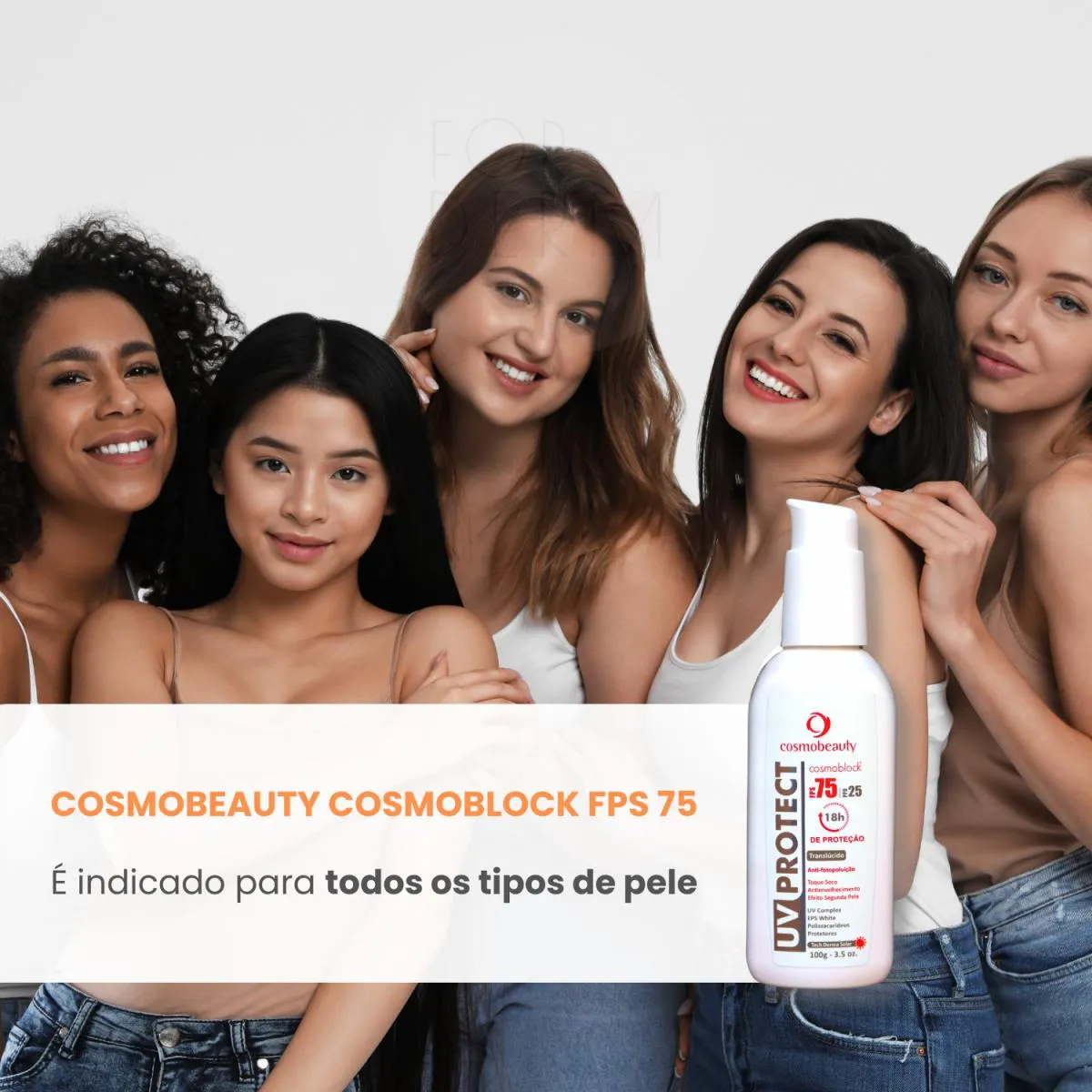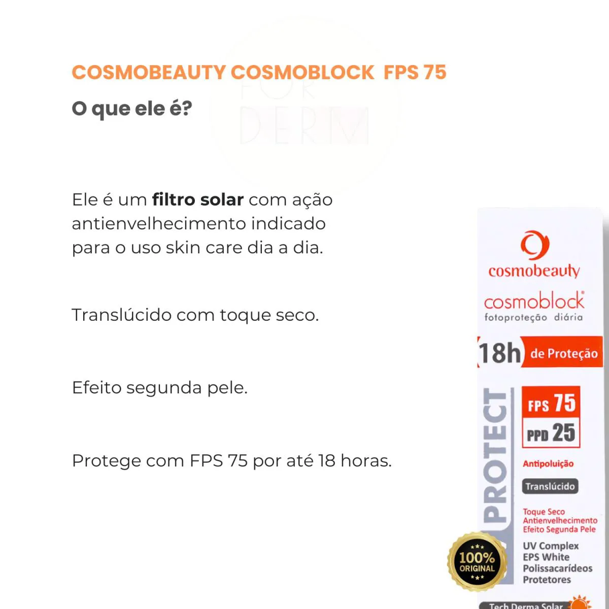 O Cosmoblock UV Protect é um filtro solar com proteção solar FPS75 e PPD25, desenvolvido com tecnologia de toque seco e efeito segunda pele. Possui uma fórmula com dupla ação antienvelhecimento e proteção solar, contendo filtros solares fotoestavéis e polissacarídeos protetores que combatem agressões externas e previnem o desgaste cutâneo causado pela exposição solar.