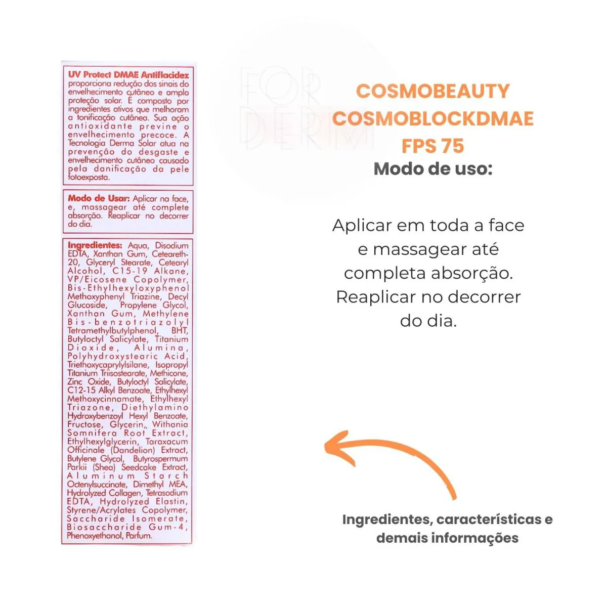 O Cosmobeauty Filtro Solar Cosmoblock é um protetor solar com tecnologia avançada, desenvolvido especificamente para peles envelhecidas, com fator de proteção solar FPS 75 e formulação que combina ativos antienvelhecimento. Possui uma composição que inclui ingredientes como DMAE, colágeno, elastina e complexos protetores que atuam na proteção e recuperação da pele.