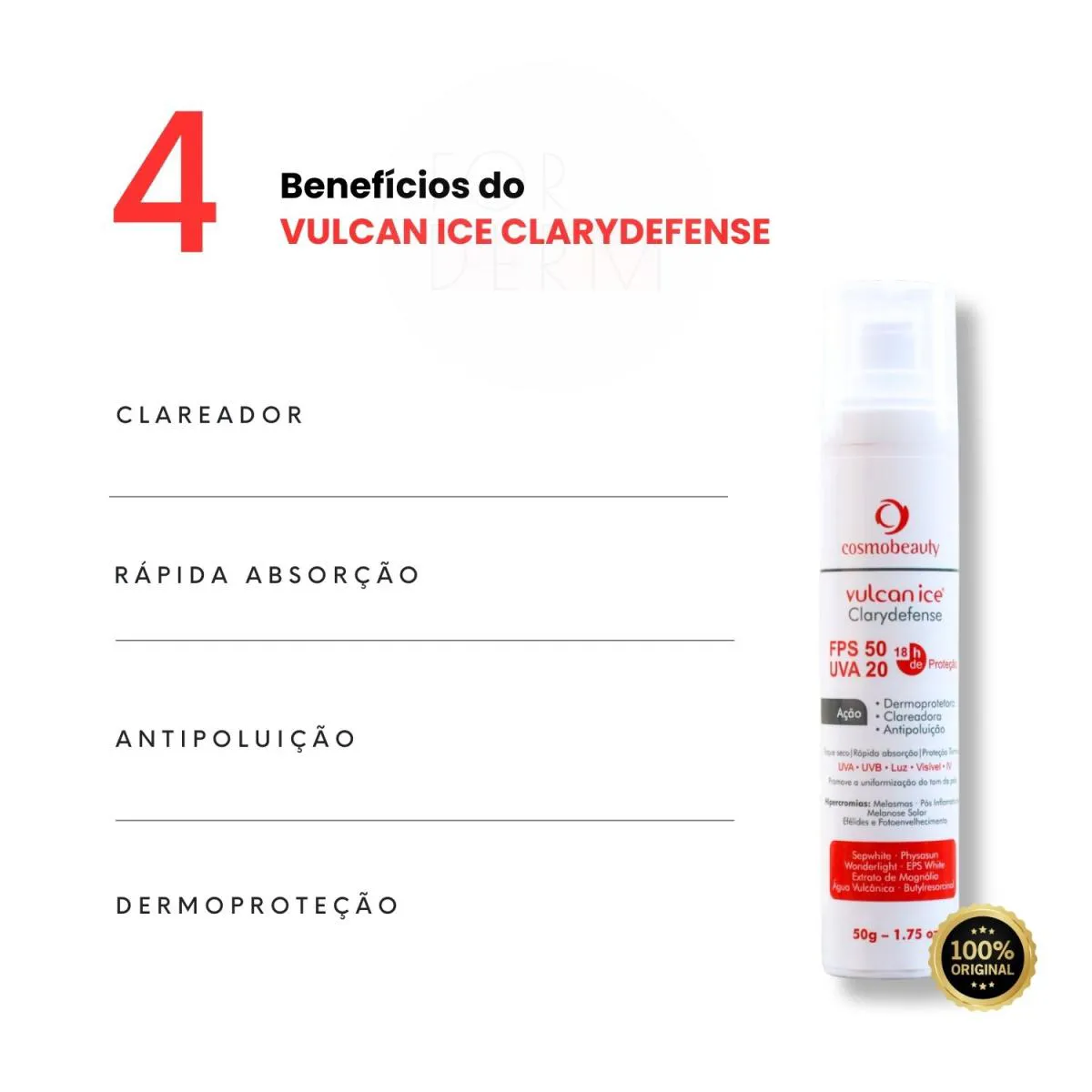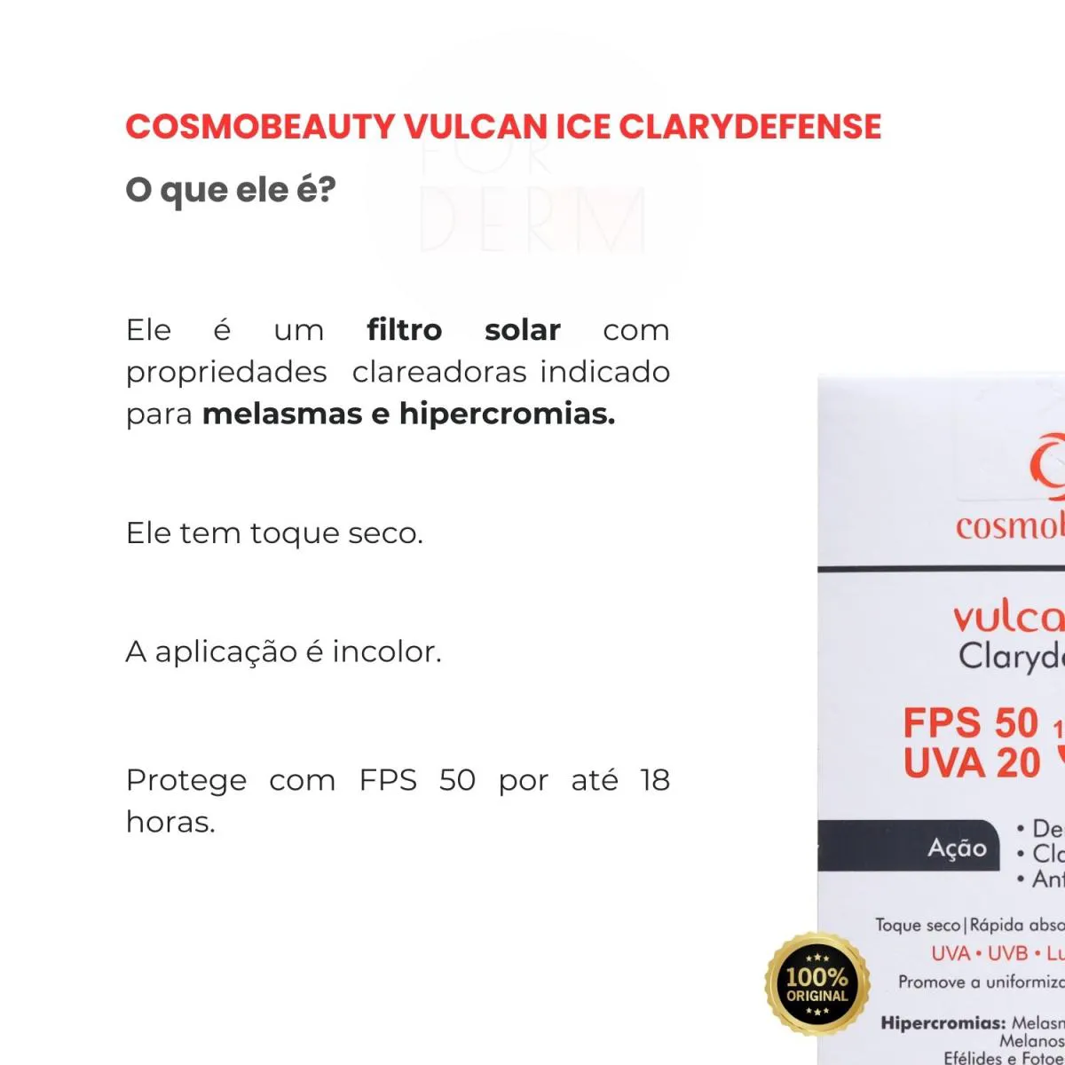 O Cosmobeauty Filtro Solar Vulcan Ice Clarydefense é um protetor solar clareador com ação multifuncional, desenvolvido especificamente para peles com alterações pigmentares. Possui tecnologia de proteção térmica e composição especial para tratamento de manchas e hipercromias cutâneas.