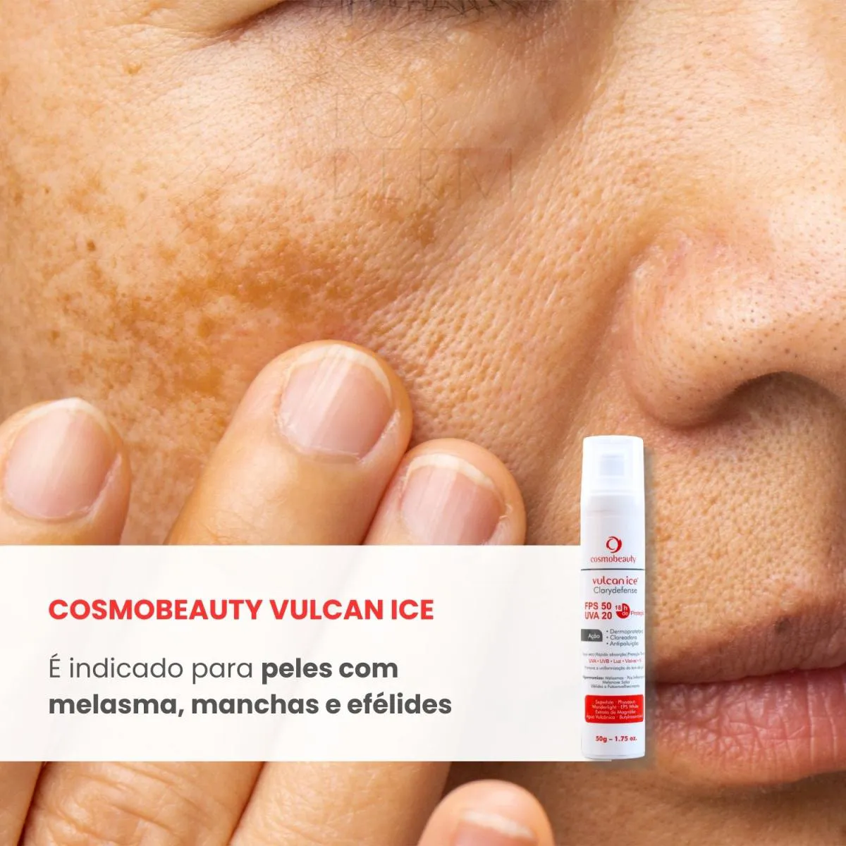 O que é e para que serve o Cosmobeauty Filtro Solar Vulcan Ice Clarydefense Fps 50 Melasmas 18H 50G?
