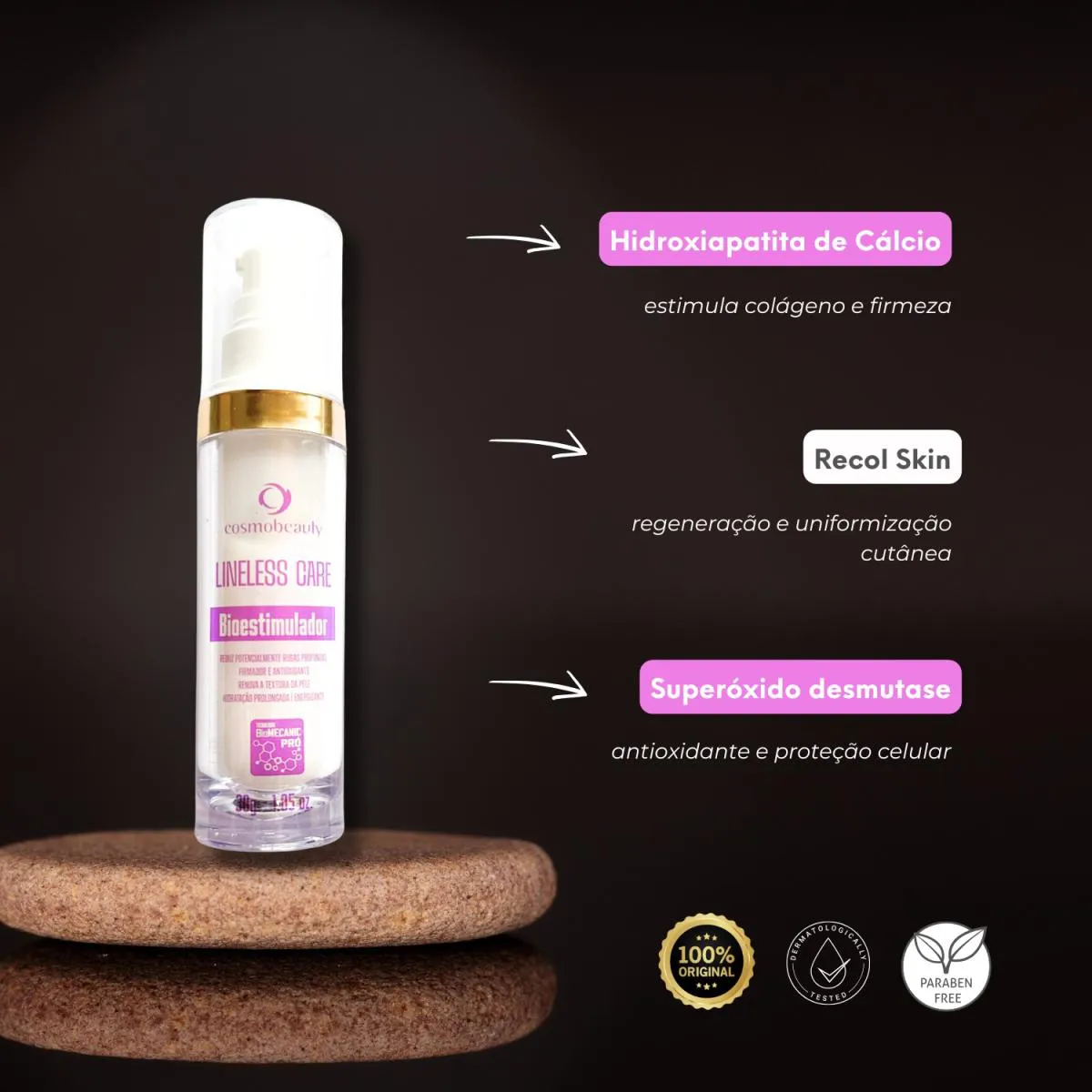 CARACTERÍSTICAS Bioestimulador facial com ação antienvelhecimento Reduz rugas profundas e melhora firmeza da pele Renova textura com hidratação prolongada Ação antioxidante e protetora contra radicais livres PRINCIPAIS ATIVOS Hidroxiapatita de cálcio estimula colágeno e firmeza Recol Skin regeneração e uniformização cutânea Superóxido desmutase antioxidante e proteção celular MODO DE USO Aplicar sobre a face limpa e seca Massagear até completa absorção Usar duas vezes ao dia para melhores resultados