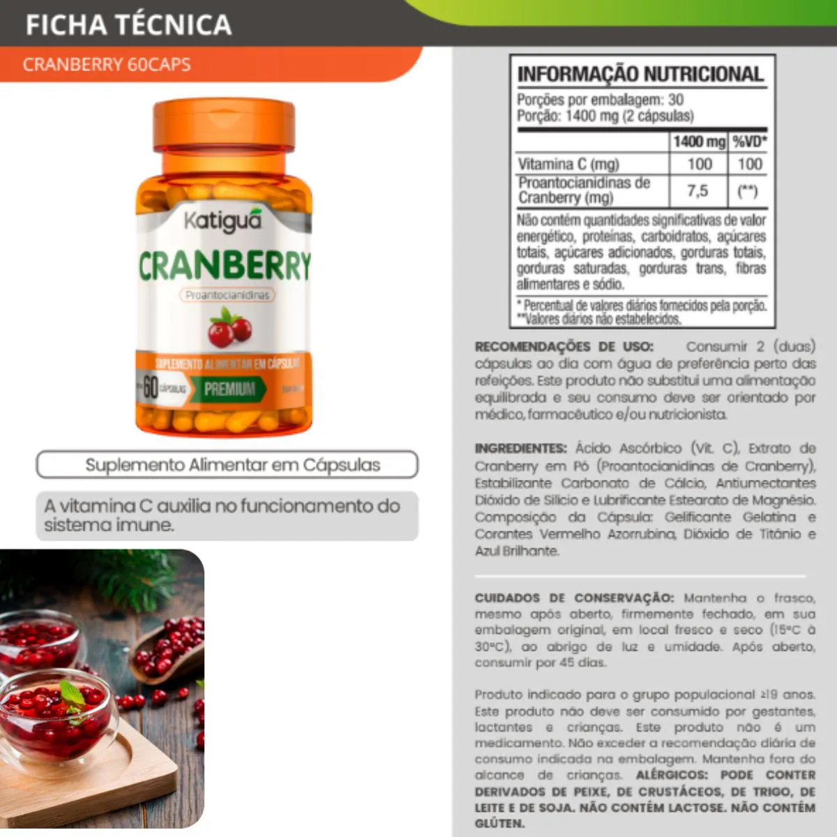O Cranberry Katiguá é um suplemento alimentar à base de extrato da fruta cranberry (Vaccinium macrocarpon), fonte natural de antioxidantes.Benefícios: