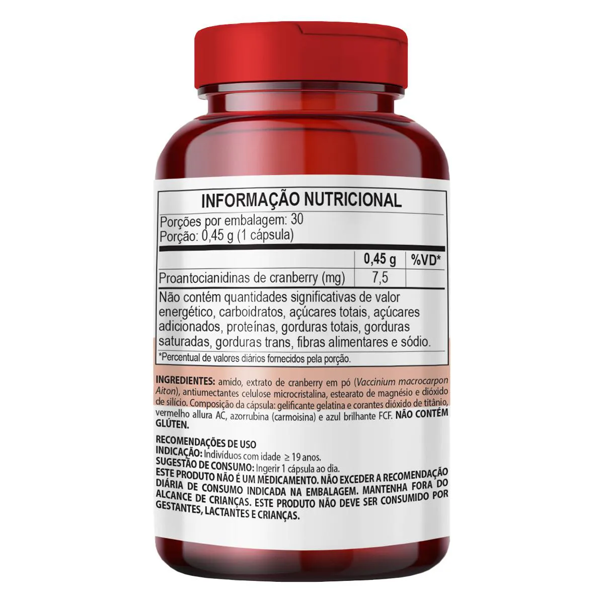 Cranberry 30 Cápsulas 450mg ClinicMais Modo de uso: Ingerir 1 cápsula ao dia. Ingredientes: Cranberry em pó (Vaccinium macrocarpon). Excipientes: talco e celulose microcristalina. Antiumectantes: estearato de magnésio e dióxido de silício. Composição da cápsula: gelatina, corantes (dióxido de titânio, vermelho 40, vermelho 14 e azul brilhante). Não contém glúten. Não contém lactose. 0% adição de açúcares.