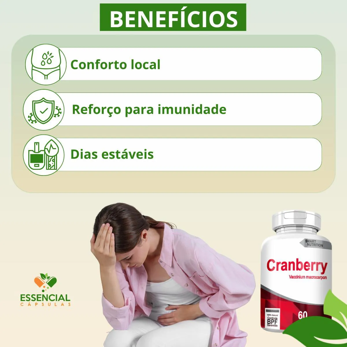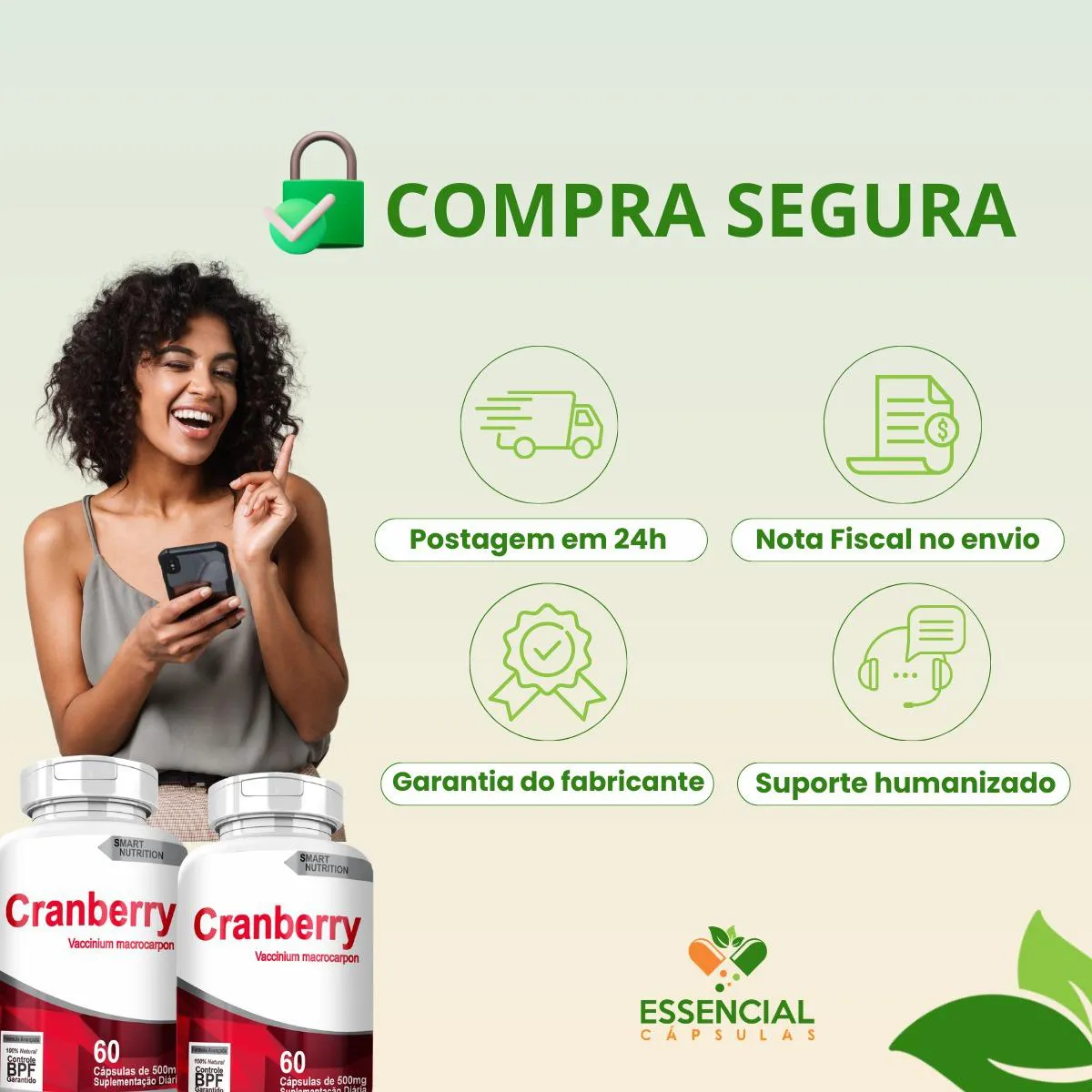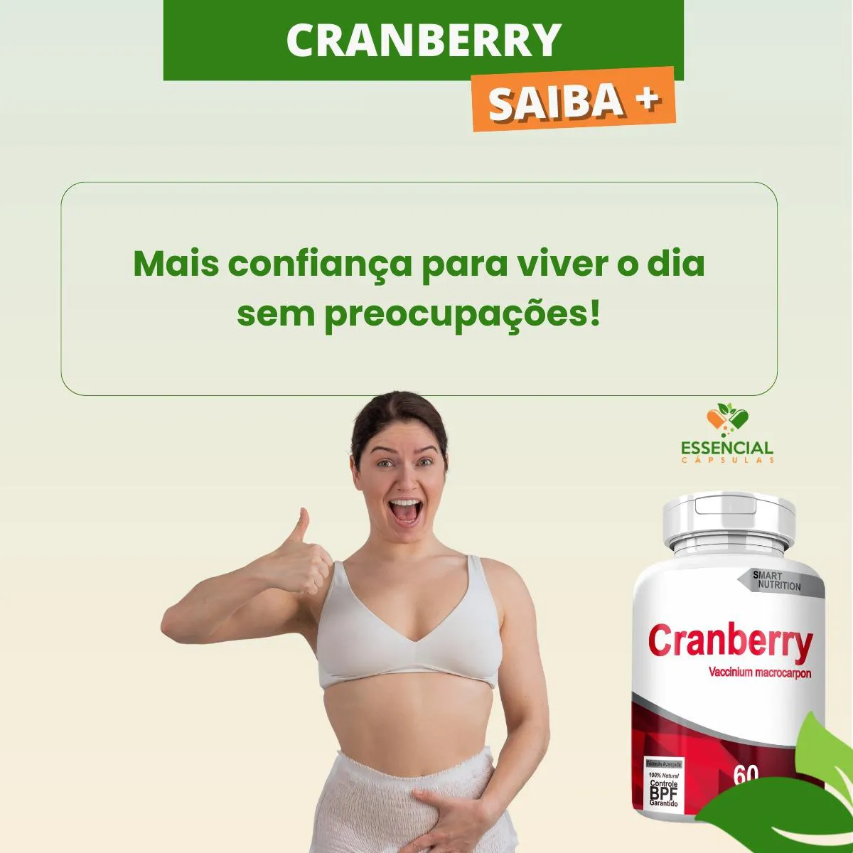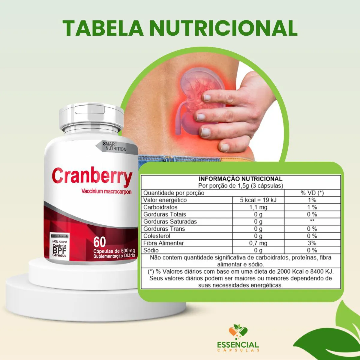 BEM VINDO(A) À ESSENCIAL CÁPSULAS Aqui, acreditamos que cuidar da saúde pode (e deve) ser algo natural, leve e diário. PRODUTO: - Cranberry MARCA: - 4Elementos BENEFÍCIOS: ● Frequentemente utilizado em rotinas femininas preventivas ● Escolha estratégica para cuidado íntimo contínuo SUGESTÃO DE CONSUMO (PELO FABRICANTE): - 1 cápsula de uma a três vezes ao dia - Ingerir com 200ml de água IMPORTANTE SABER: - Este produto é um suplemento alimentar natural. - Não é medicamento e não substitui uma alimentação equilibrada nem o acompanhamento de um profissional da saúde. - Como um produto natural, seus benefícios podem ser vistos a partir de alguns dias do uso. - Os suplementos são destinados a pessoas saudáveis. Sua finalidade é fornecer nutrientes, substâncias bioativas, enzimas ou probióticos em complemento à alimentação. COMPOSIÇÃO: - CRANBERRY EXTRATO (VACCINIUM MACROCARPON) SECO EM PÓ. NÃO CONTÉM GLÚTEN CONTRAINDICAÇÃO: - O uso não é recomendado para gestantes, lactantes e crianças. - Em caso de uso contínuo de medicamentos ou condições específicas de saúde, busque a orientação de um profissional da saúde. QUALIDADE: - Sabemos que o mercado de suplementos é competitivo, com opções para todos os públicos e faixas de preço. Na nossa loja, priorizamos a qualidade em cada detalhe. Por isso, escolhemos trabalhar apenas com fábricas que utilizam matérias-primas de excelência e seguem rigorosos padrões de produção. ENVIAMOS RAPIDINHO: - Seu pedido é preparado com todo cuidado e postado em até 24 horas úteis após a confirmação da compra. (Na maioria das vezes, enviamos bem antes disso)! FALE CONOSCO: Tem dúvidas ou quer conversar sobre o produto? Nosso atendimento é humanizado e está sempre pronto para te ouvir com muita atenção!