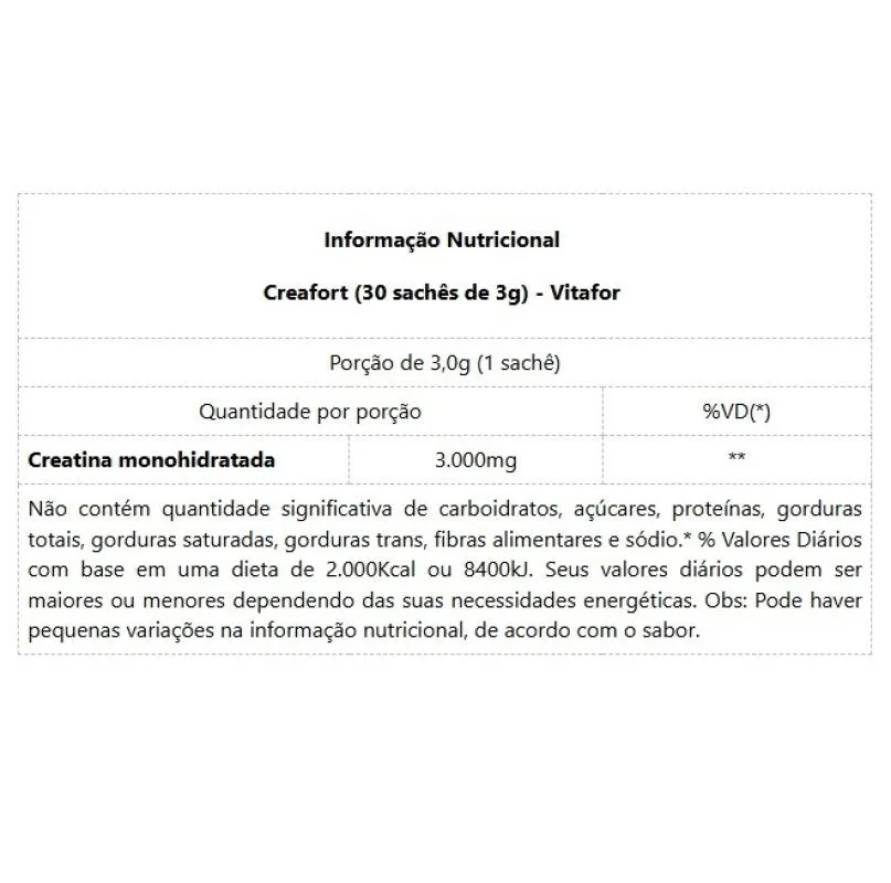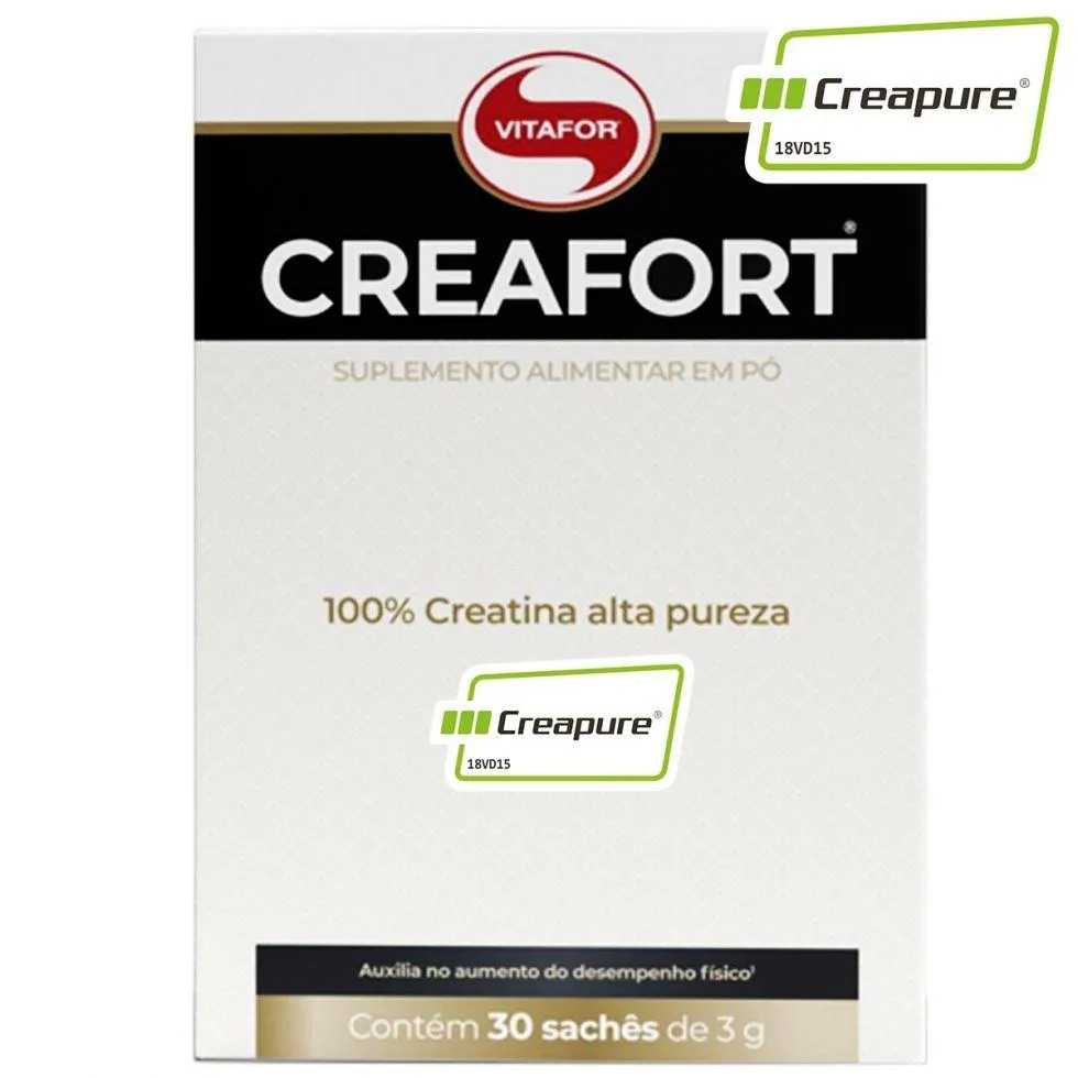 CREAFORT (30 sachês de 3g) - VITAFOR A Creafort da Vitafor é um suplemento alimentar por creatina monohidratada de alta pureza. A suplementação de creatina mantém a concentração de ATP – composto bioquímico responsável pela geração de energia rápida nos músculos - que favorece a força e a explosão para exercícios de alta intensidade. BENEFÍCIOS * Creatina de alta pureza produzida na Alemanha;* Auxilia no aumento do desempenho físico durante exercícios repetidos de curta duração e alta intensidade;* 100% Creapure®;* Único na versão sachê.