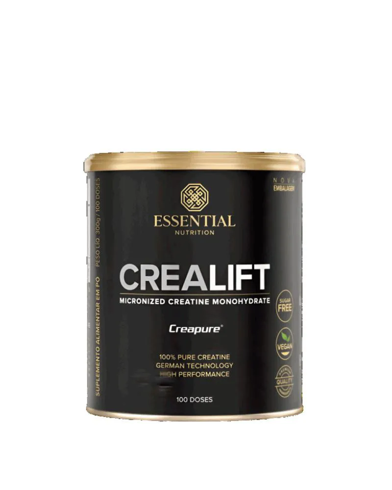 CREALIFT (300g) - ESSENTIAL NUTRITION O QUE É CREALIFTA procedência e pureza da creatina são fundamentais para a sua eficácia e segurança.Crealift é 100% Creapure®, uma creatina alemã monohidratada vegana altamente purificada e reconhecida internacionalmente por sua superior qualidade.Crealift é produzido sob a mais alta tecnologia em um processo rígido de controle de qualidade durante todo o processo produtivo para garantir um produto comprovadamente eficaz.Crealift é composto exclusivamente por Creapure®, creatina monohidratada vegana resultado de um processo patenteado desenvolvido pela empresa alemã Alzchem Trotsberg GmbH, que controla o processo produtivo do início ao fim com extremo rigor.Seu padrão de pureza e qualidade é internacionalmente reconhecido, uma vez que cada lote produzido é testado individualmente através de métodos de análise de alta precisão.Creapure® é completamente livre de substâncias proibidas como esteróides e estimulantes, e não contém subprodutos tóxicos e prejudiciais à saúde (DCD, DHT, metil mercaptano, tioureia e dimetil sulfato). A Creatina monohidratada utilizada pela Essential Nutrition foi avaliada pela rigorosa Food and Drug Administration(FDA), dos EUA, constatando 99,95% de pureza (Laudo FDA).O PONTO FORTE DA CREALIFTA creatina é um composto inicialmente produzido a partir de 3 aminoácidos (L-glicina, L-arginina e L-metionina) e armazenada predominantemente nos músculos esqueléticos (cerca de 95%). Durante o exercício, a quantidade de creatina armazenada no músculo pode ser fator determinante para o desempenho físico. Uma vez que as principais fontes de creatina são de origem animal (carne vermelha, frango ou peixes), sua suplementação pode ser uma importante alternativa para vegetarianos e veganos.Entre tantos suplementos, a creatina é um dos mais pesquisados. Muitos desses estudos são focados nos efeitos da creatina monohidratada, a mais eficaz, segundo os cientistas que ultimamente têm se dedicado a estudar a creatina em idosos e pacientes com fibromialgia. Com o envelhecimento e a redução da atividade física, a creatina muscular em idosos tende a diminuir, e assim reduzem-se a massa muscular, densidade óssea e resistência física. COMO FUNCIONAA suplementação aumenta o armazenamento de creatina e promove uma rápida regeneração de ATP (adenosina trifosfato). BENEFÍCIOS: - 100% creatina monohidratada altamente purificada Creapure;- Exclusivo processo patenteado de alta tecnologia alemã (AlzChem AG);- Alta biodisponibilidade;- Produto vegano.