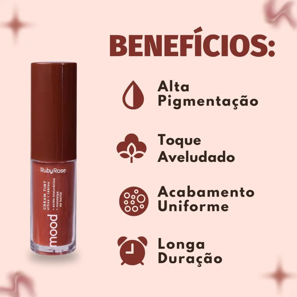 O Cream Tint Olhos e Lábios Ruby Rose Mood Mauve C20 HB-575-1 é o produto multifuncional perfeito para quem ama praticidade e beleza em um só passo. Com textura cremosa e acabamento aveludado, ele pode ser usado como batom, blush cremoso e sombra, proporcionando cor, conforto e alta fixação. Sua tonalidade mauve rosado é elegante, versátil e combina com todos os tons de pele, deixando um visual natural e sofisticado.Benefícios Principais