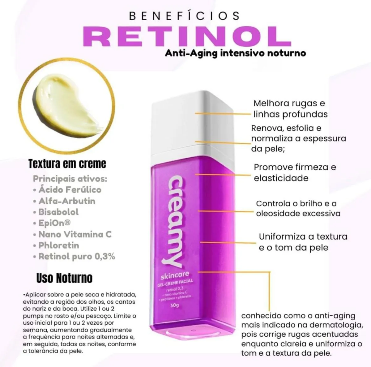 Contém 0,3% de retinol puro (vitamina A), conhecido como o anti-aging mais tradicional na dermatologia, pois corrige rugas enquanto clareia e uniformiza o tom e a textura da pele.
