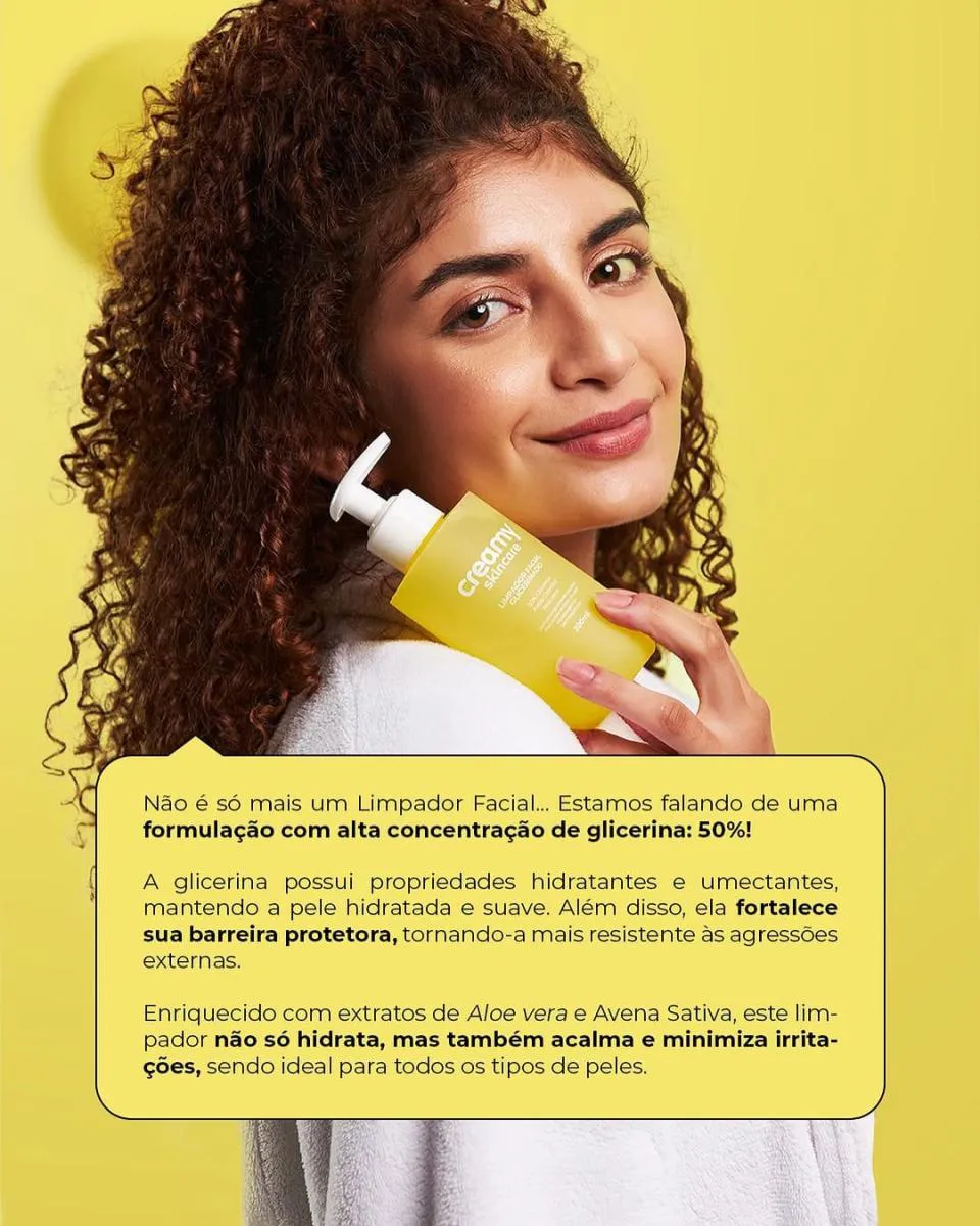 O Limpador Facial Glicerinado da Creamy é formulado com uma alta concentração de glicerina, 50%, um ingrediente versátil e altamente benéfico. A glicerina possui propriedades hidratantes e umectantes, atraindo umidade para a pele e mantendo-a hidratada e suave. Além disso, ela fortalece sua barreira protetora, tornando-a mais resistente às agressões externas. Enriquecido com extratos de Aloe vera e Avena Sativa, este limpador não só hidrata, mas também acalma e minimiza irritações, sendo ideal todos os tipos de peles: oleosas, normais, peles secas e sensíveis.