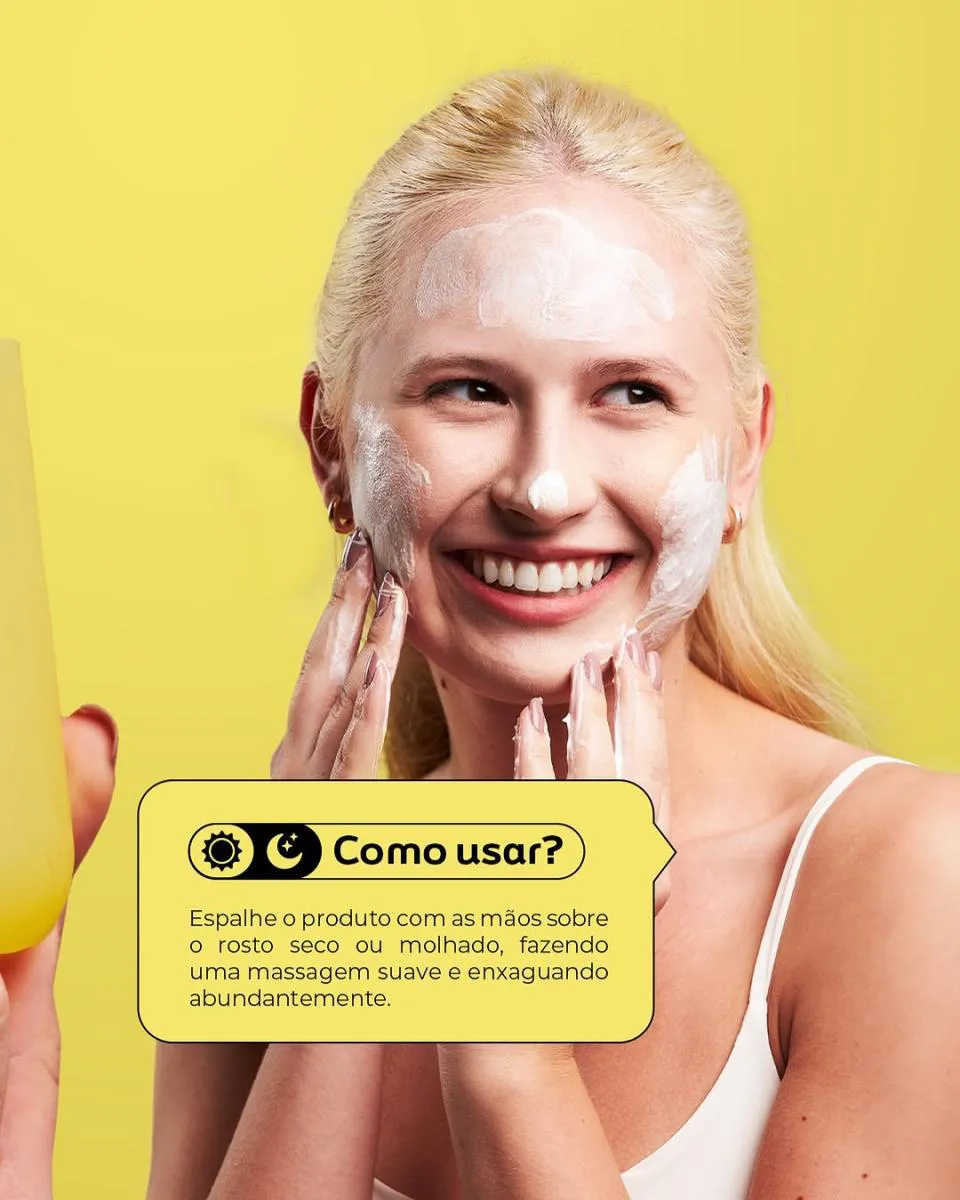 Espalhe o produto com as mãos sobre o rosto seco ou molhado, fazendo uma massagem suave e enxaguando abundantemente.