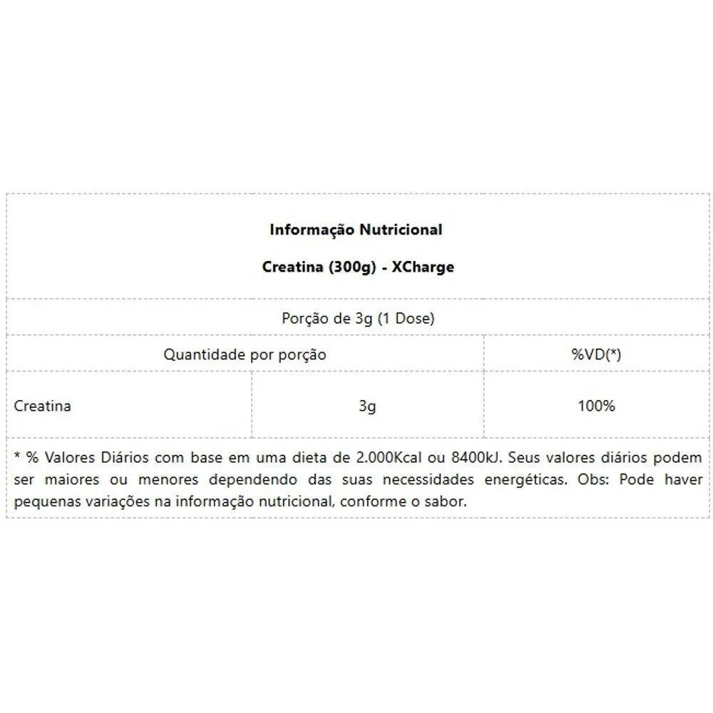 Informação Nutricional Creatina (300g) - XChargePorção de 3g (1 Dose)Quantidade por porção%VD(*)Creatina3g100%* % Valores Diários com base em uma dieta de 2.000Kcal ou 8400kJ. Seus valores diários podem ser maiores ou menores dependendo das suas necessidades energéticas. Obs: Pode haver pequenas variações na informação nutricional, conforme o sabor.