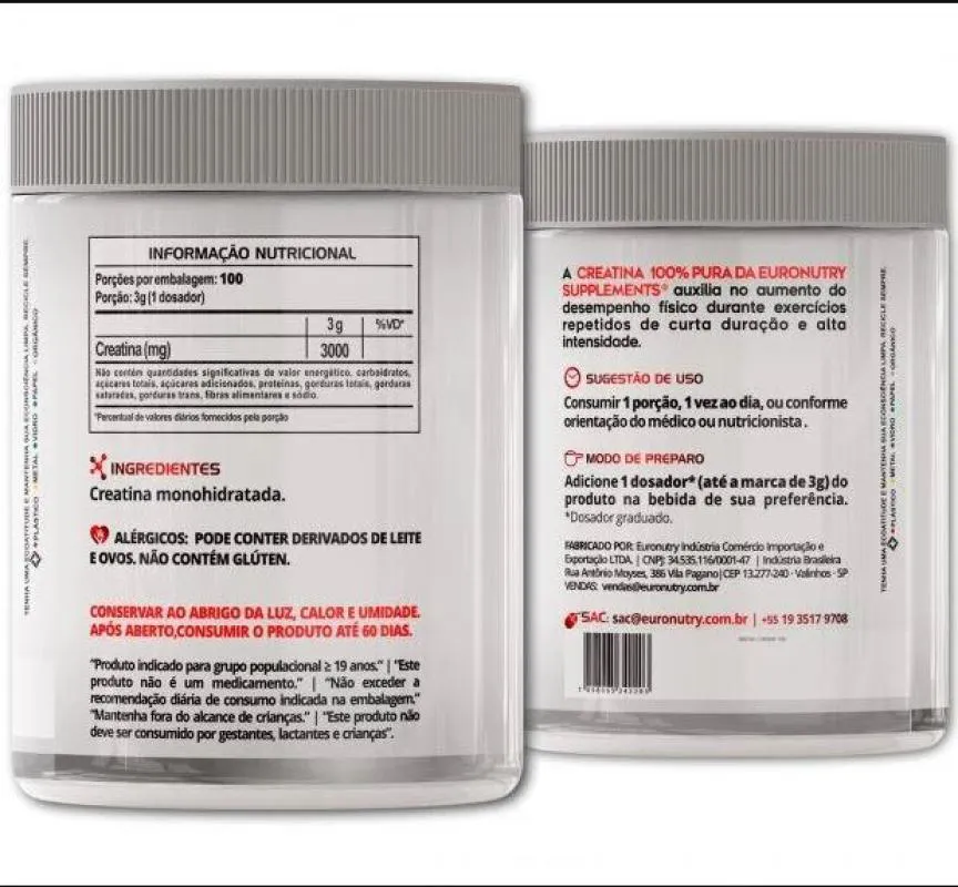 creatina Monohidratada 300g Euronutry – Energia, Força e Desempenho Máximo! Descrição do Produto A Creatina Monohidratada Euronutry 300g é o suplemento ideal para quem busca melhorar a performance nos treinos, aumentar a força e acelerar o ganho de massa muscular. Produzida com creatina 100% pura e de alta qualidade, ela garante máxima absorção e resultados consistentes. A creatina atua como combustível rápido para os músculos durante exercícios intensos, ajudando a elevar a potência, reduzir a fadiga e otimizar a recuperação muscular. É indicada tanto para quem pratica musculação quanto para atletas de esportes de alta intensidade. ⚡ Benefícios Aumenta força e resistência muscular Melhora o desempenho físico em treinos intensos Favorece o ganho de massa magra Reduz o cansaço e acelera a recuperação 100% pura, sem aditivos ou misturas