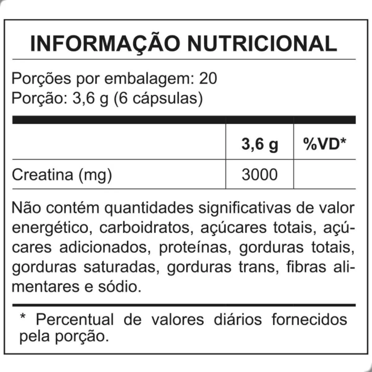 Sua composição combina creatina monohidratada micronizada encapsulada, sem aditivos, selecionados cuidadosamente para garantir qualidade e estabilidade. A fórmula é livre de ingredientes desnecessários como açúcares adicionados, glúten ou lactose, sendo indicada para diferentes perfis de consumo.