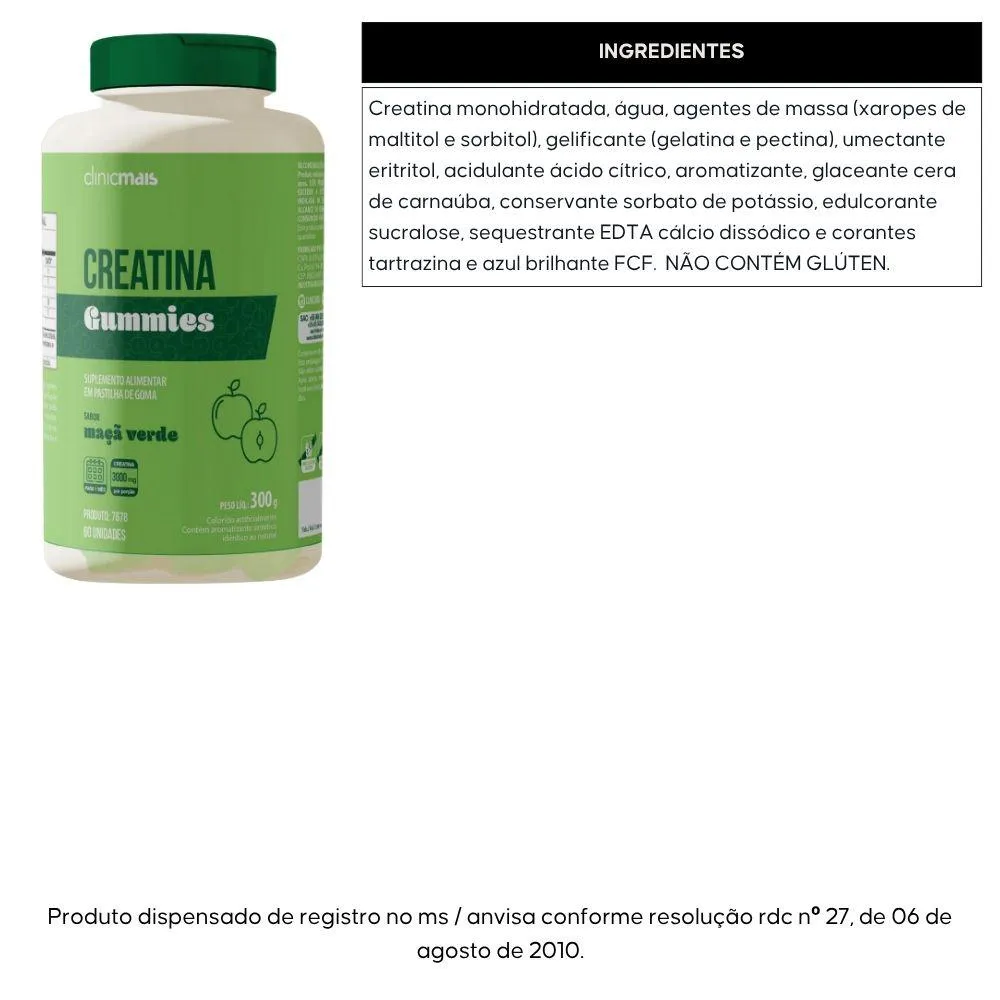 Creatina monohidratada, água, agentes de massa (xaropes de maltitol e sorbitol), gelificante (gelatina e pectina), umectante eritritol, acidulante ácido cítrico, aromatizante, glaceante cera de carnaúba, conservante sorbato de potássio, edulcorante sucralose, sequestrante EDTA cálcio dissódico e corantes tartrazina e azul brilhante FCF. NÃO CONTÉM GLÚTEN