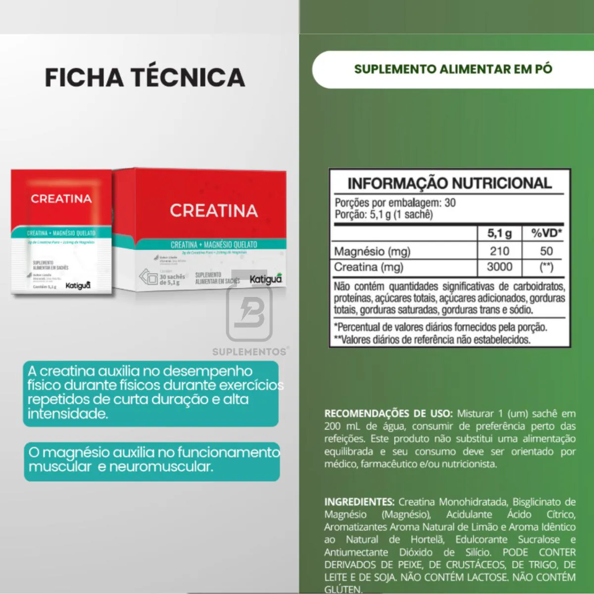 É um suplemento alimentar composto por creatina monohidratada e magnésio quelato, apresentado em 30 sachês com sabor de limão. O produto combina ingredientes que auxiliam no desempenho físico e na recuperação muscular, sendo desenvolvido para praticantes de atividade física que buscam melhorar sua performance.