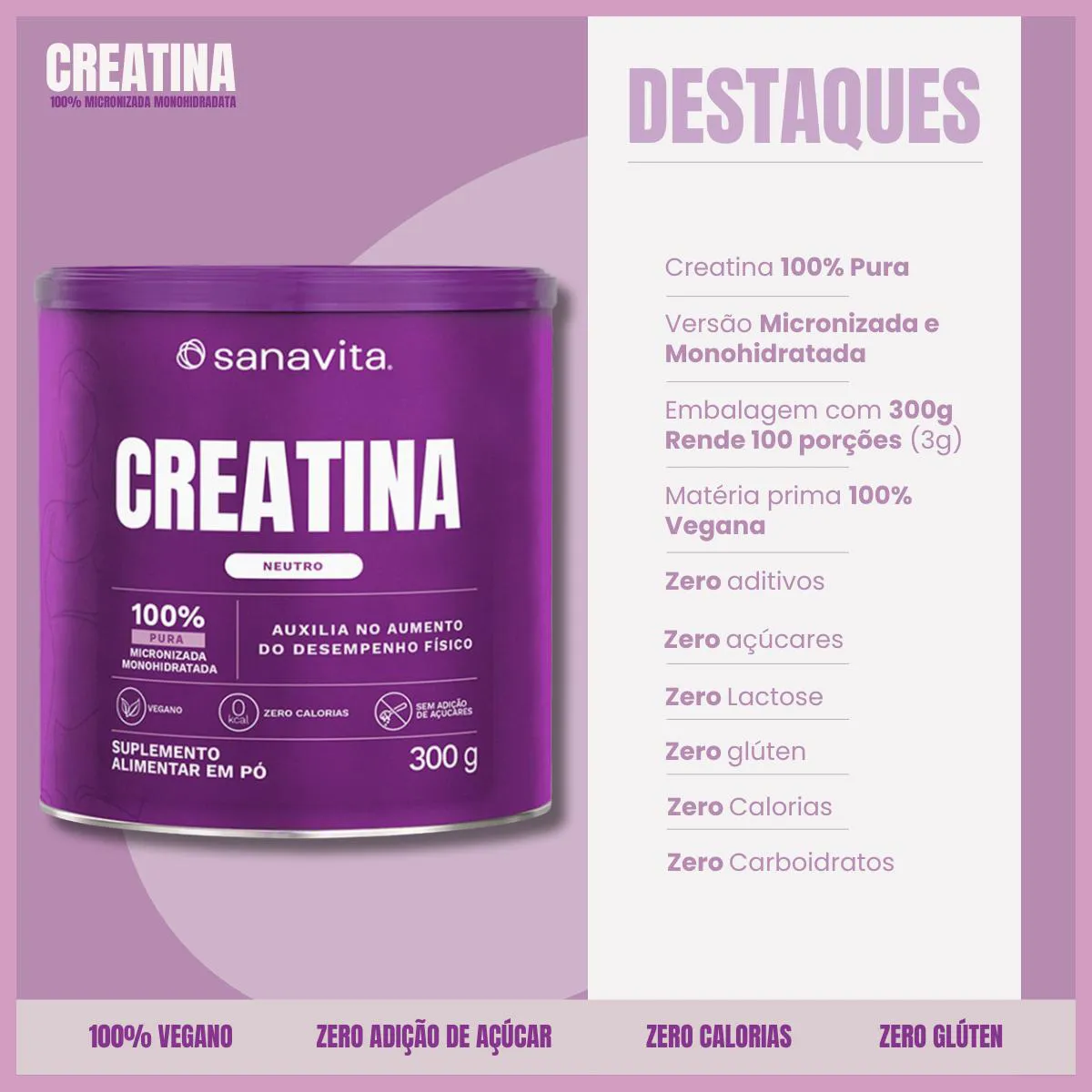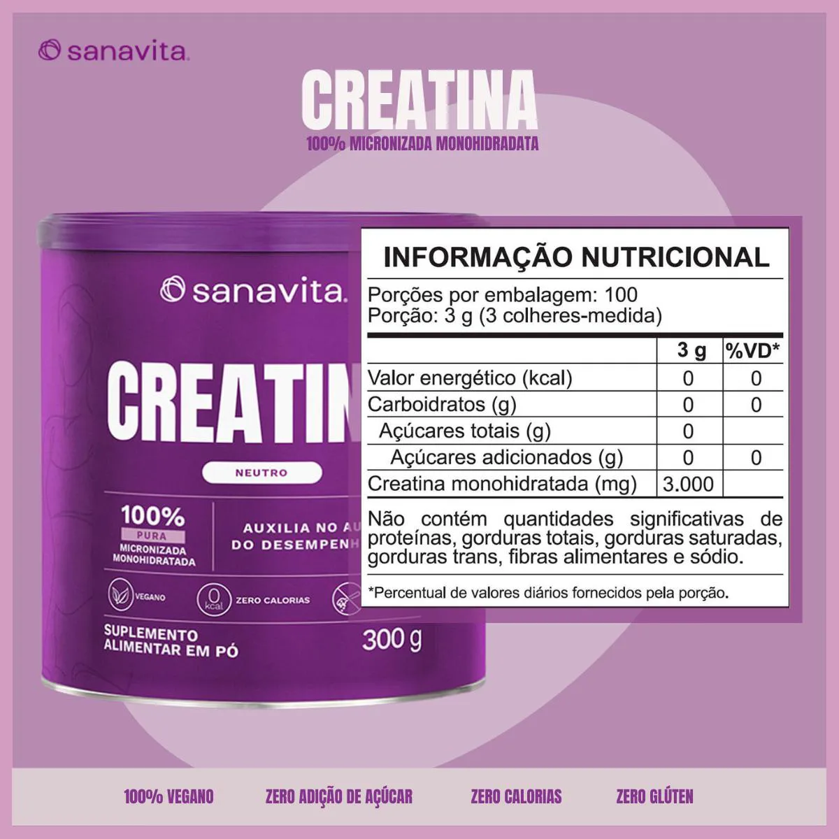 A creatina 300g da Sanavita é um suplemento de creatina monohidratada, de altíssima pureza e micronizada, que garante boa absorção e eficácia comprovada. A creatina é fundamental para fornecer energia rápida às células musculares durante exercícios de alta intensidade e curta duração, como musculação, crossfit e treinamento funcional.