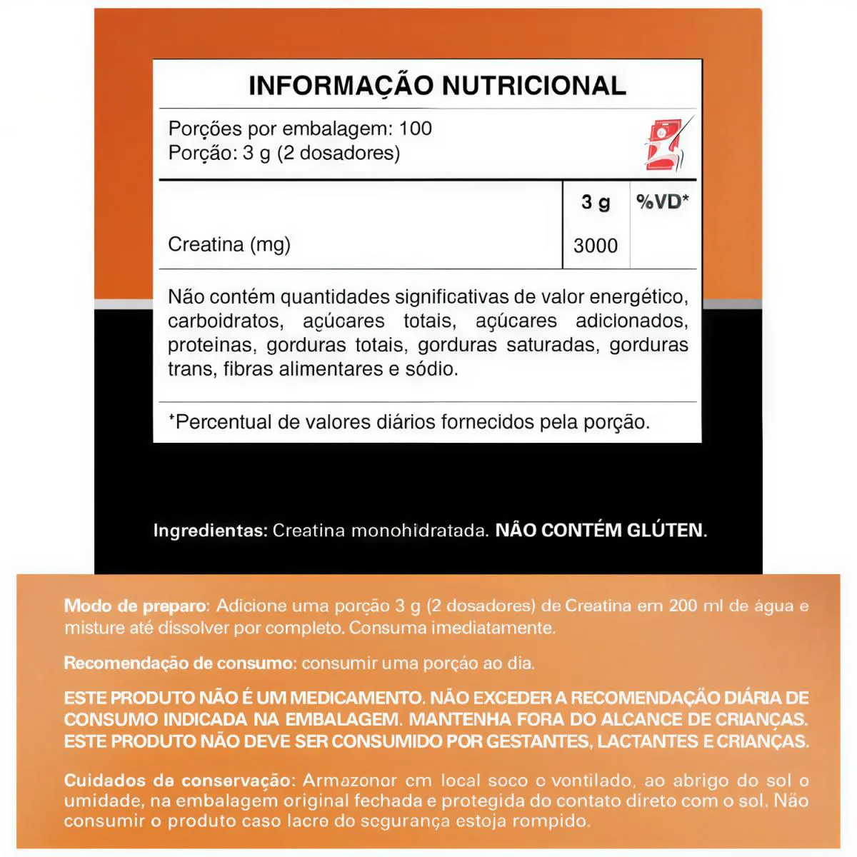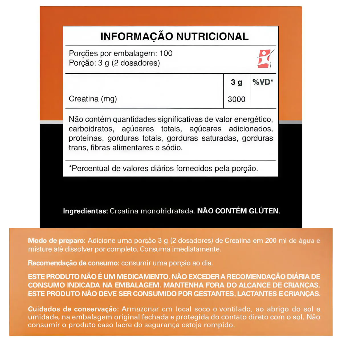 DESCRIÇÃO A creatina é uma substância produzida pelo corpo a partir de alimentos de origem animal, como carnes, peixes e laticínios. Ela é formada com a ajuda de três aminoácidos: glicina, arginina e metionina. Uma vez produzida, a creatina é transportada para os músculos, onde ajuda a fornecer energia para atividades intensas. Quando suplementada, a creatina ajuda a aumentar a quantidade desse composto nos músculos, melhorando a energia disponível para treinos de alta intensidade. BENEFÍCIOS · Aumento de força muscular · Melhora do desempenho físico de alta intensidade, com mais explosão em movimentos rápidos · Aumento da massa muscular · Melhora e otimiza a recuperação muscular pós treino, diminuindo dores e fadiga · Pode melhorar a performance e cognitiva: alguns estudos apontam melhoria na função cerebral, auxiliando na memória e concentração · Pode prevenir lesões, devido ao aumento da resistência muscular e recuperação mais rápida · Auxilia no aumento da massa magra e na sua prevenção SUGESTÃO DE USO Consumir uma porção ao dia. Modo de preparo: Adicione uma porção 3 g (2 dosadores) de Creatina em 200 ml de água e misture até dissolver por completo. Consuma imediatamente COMPOSIÇÃO Creatina monohidratada. NÃO CONTÉM GLÚTEN. PRECAUÇÕES - ADVERTÊNCIAS - CONSERVAÇÃO Anexo nas imagens do anúncio.